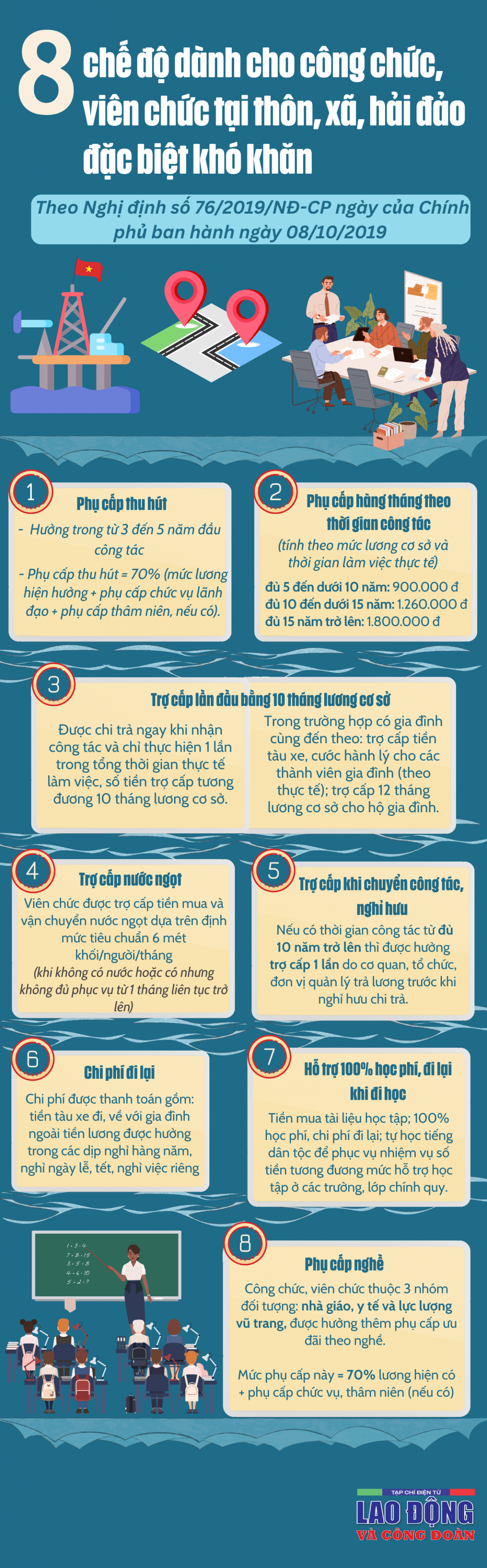 Tại Nghị định số 76/2019, Chính phủ quy định 8 chế độ đối với cán bộ, công chức, viên chức, người lao động và người hưởng lương trong lực lượng vũ trang công tác ở vùng có điều kiện kinh tế - xã hội đặc biệt khó khăn.