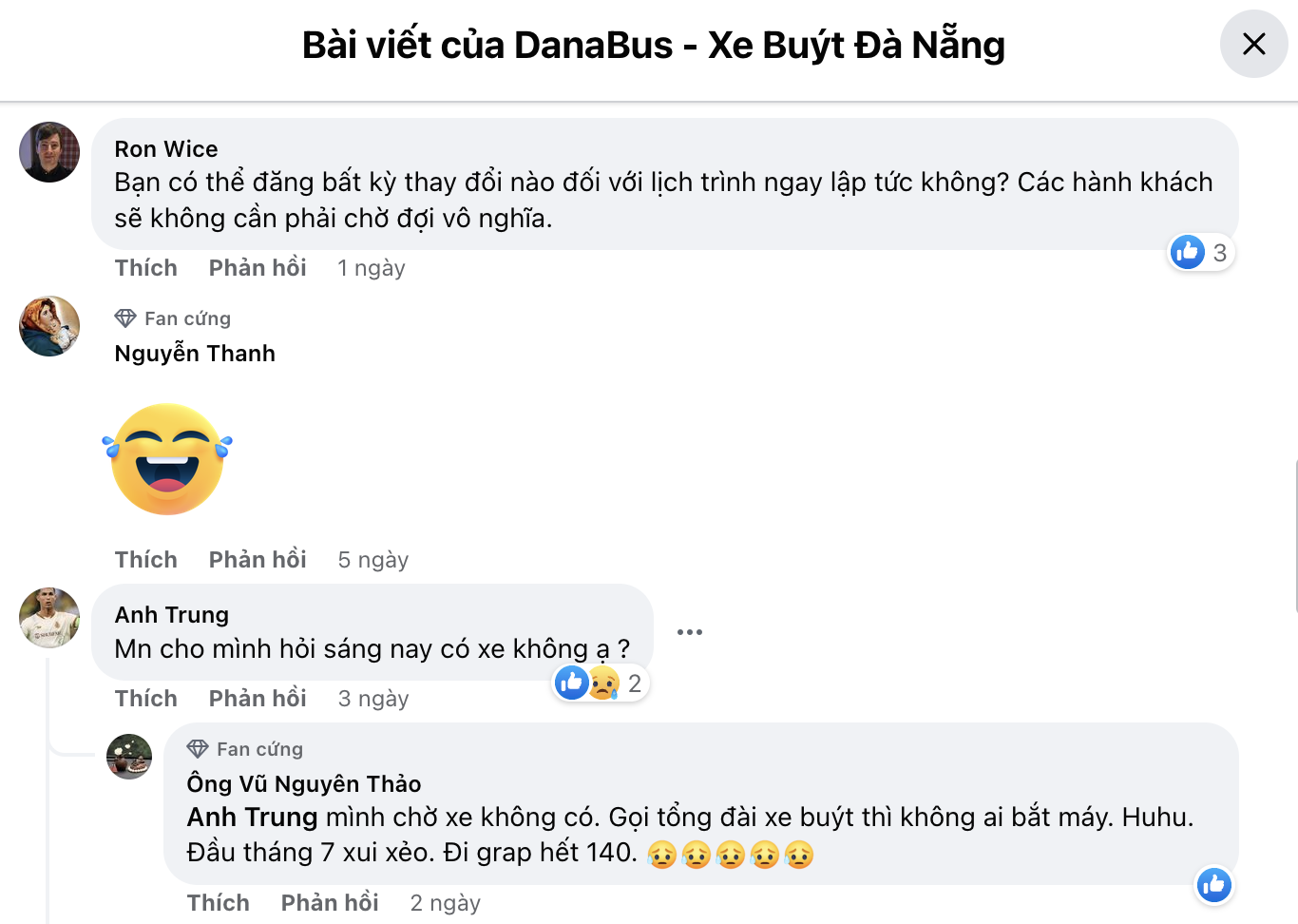 Ghi nhận thêm của phóng viên, trên Facebook DanaBus - Xe buýt Đà Nẵng, nhiều người dân đã để lại bình luận trong bài đăng mới nhất hỏi thông tin xe buýt có chạy không? Họ đã chờ đợi xe nhưng không có, buộc phải dùng dịch vụ xe Grab để đi lại, tốn kém.