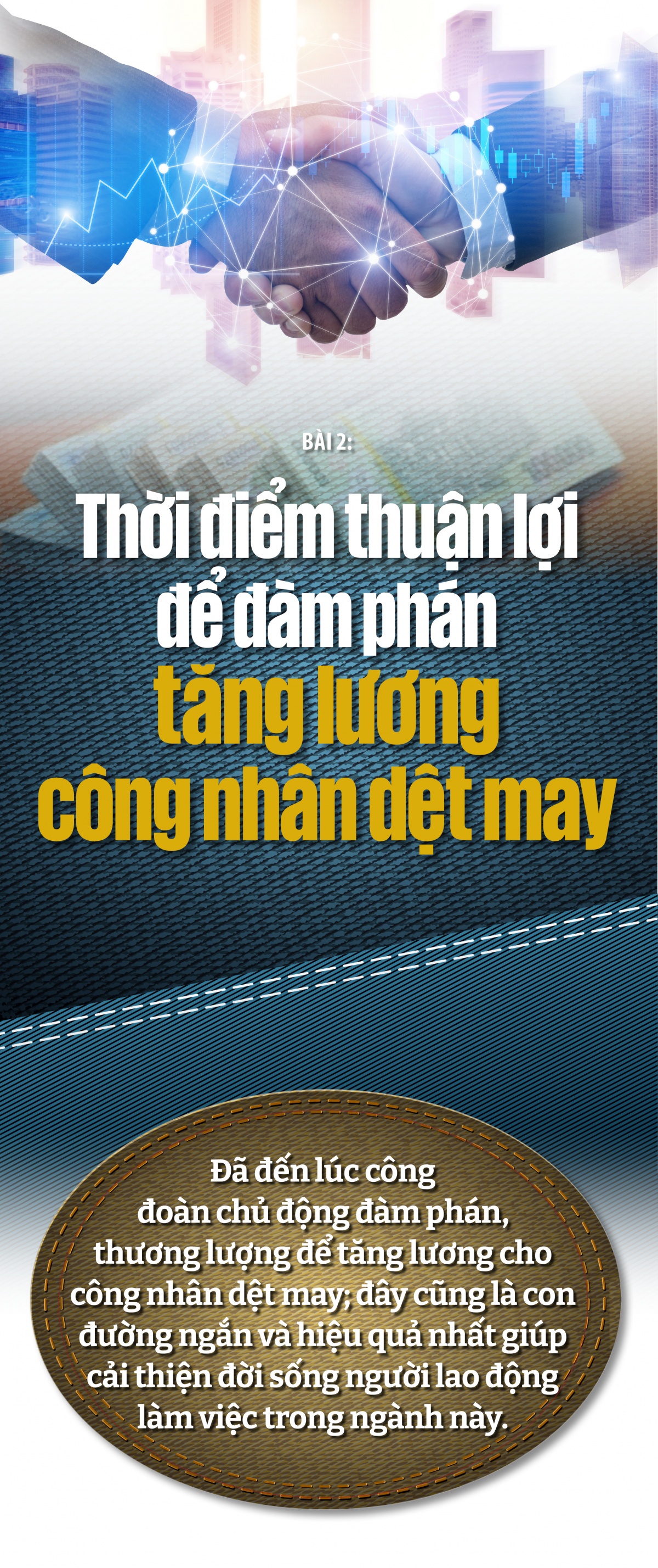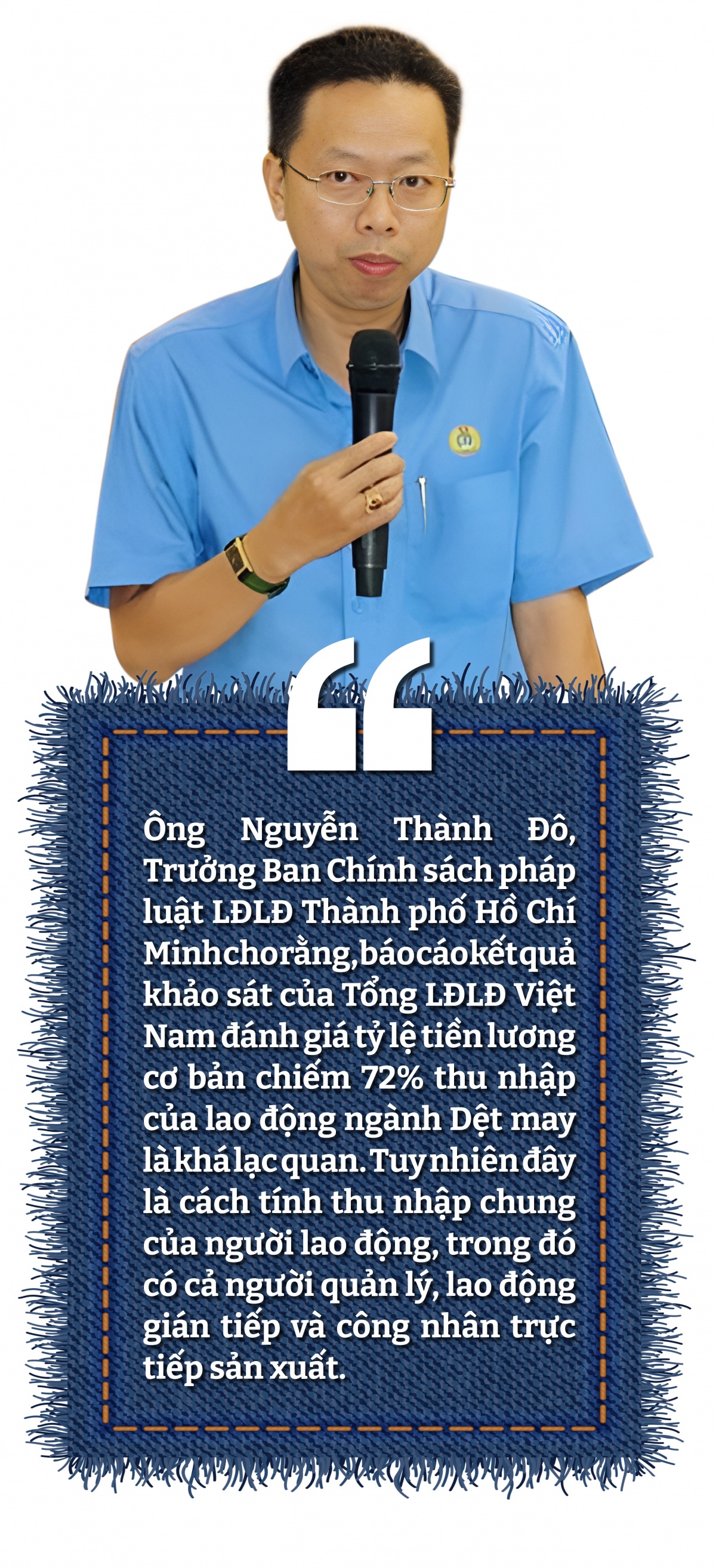 Ông Nguyễn Thành Đô, Trưởng Ban Chính sách pháp luật LĐLĐ Thành phố Hồ Chí Minh cho rằng, báo cáo kết quả khảo sát của Tổng LĐLĐ Việt Nam đánh giá tỷ lệ tiền lương cơ bản chiếm 72% thu nhập của lao động ngành Dệt may là khá lạc quan. Tuy nhiên đây là cách tính thu nhập chung của người lao động, trong đó có cả người quản lý, lao động gián tiếp và công nhân trực tiếp sản xuất. Trong thực tế tiền lương cơ bản của công nhân trực tiếp ở các doanh nghiệp ngành Dệt may chỉ chiếm khoảng 60%, còn lại đều được doanh nghiệp chuyển thành các khoản thu nhập khác. “Đây là vấn đề mà các cấp công đoàn cần tiếp tục khảo sát, nghiên cứu làm cơ sở để đàm phán, thương lượng tăng mức tiền lương cơ bản và thu nhập trong thời gian tới”, ông Nguyễn Thành Đô nhấn mạnh. Theo ông Đô, hiện nay đang là thời điểm thuận lợi để công đoàn đàm phán, thương lượng về tiền lương công nhân ngành Dệt may. Bởi lẽ thực hiện chiến lược phát triển ngành Dệt may và da giày, từ nay đến năm 2030, ngành này sẽ chuyển dần sang phát triển bền vững theo mô hình kinh tế tuần hoàn; hoàn thiện chuỗi giá trị trong nước và tham gia ở vị trí có giá trị cao trong chuỗi cung ứng toàn cầu.