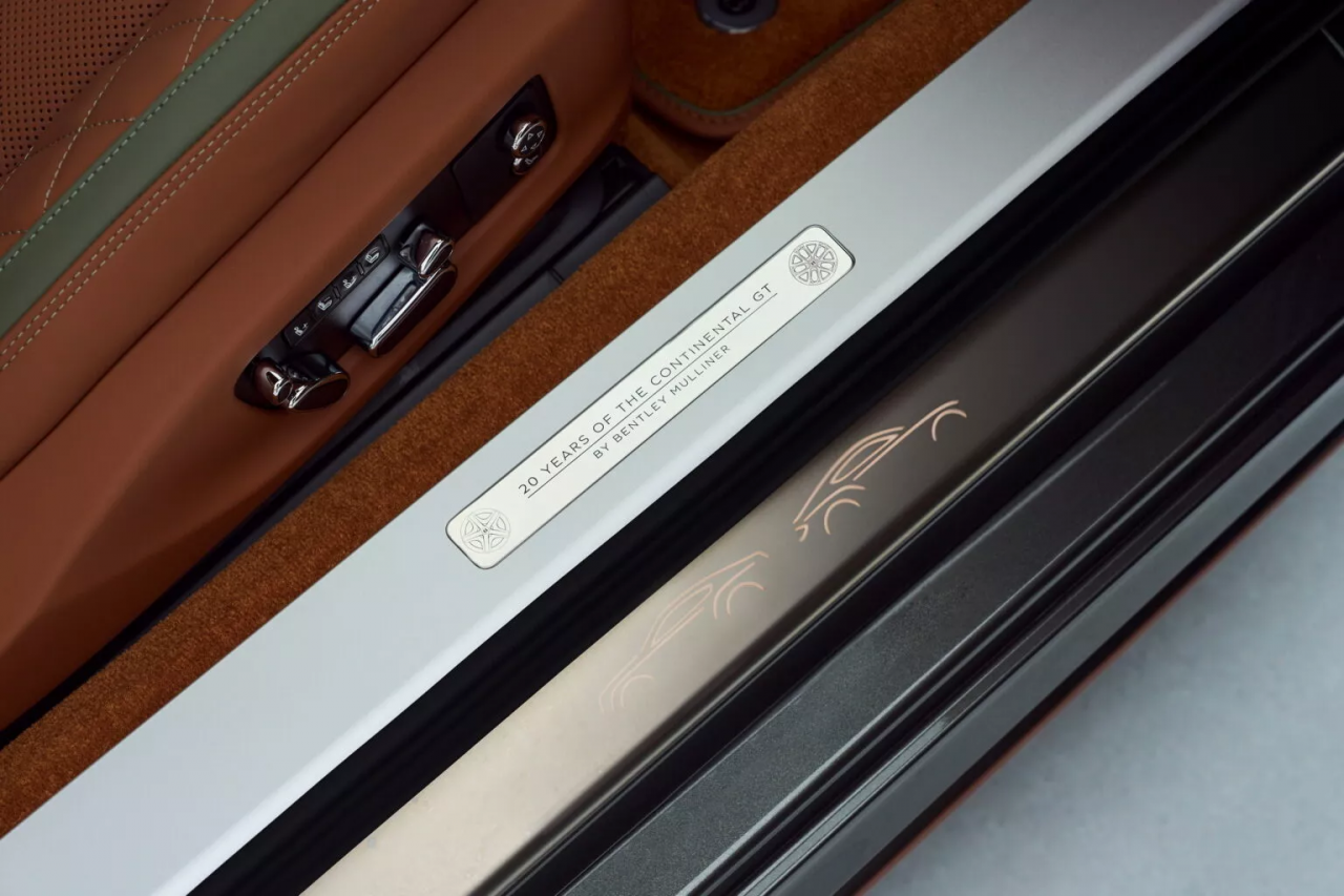 Ngoài ra, mẫu xe này cũng mang đậm dấu ấn của phiên bản kỷ niệm. Logo của phiên bản dùng dòng chữ "20 years of the Continental GT by Bentley Mulliner" cùng hình phác họa dòng này xe này thế hệ 2003-2023 xuất hiện ở trước ghế hành khách cũng như bậc cửa. Ở chính giữa còn xuất hiện dòng chữ "One of One by Bentley Mulliner" là lời khẳng định về sự độc bản của chiếc xe này. Hiện nay, chiếc xe đã được trao cho chủ nhân với mức giá không được tiết lộ.