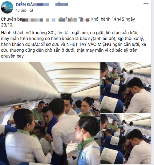 Thông tin chia sẻ như sau: "Một nữ khách hàng khoảng 30 tuổi tự dưng tím tái, ngất xỉu, co giật, liên tục cắn lưỡi, may mắn trên khoang có hành khách là bác sĩ kịp thời xử lý. Khách hàng đã được bác sĩ sơ cứu và nhét tay vào miệng để ngăn cắn lưỡi, xe cứu thương cũng đến chờ sẵn ở dưới. Thật may mắn vì có bác sỹ trên chuyến bay".