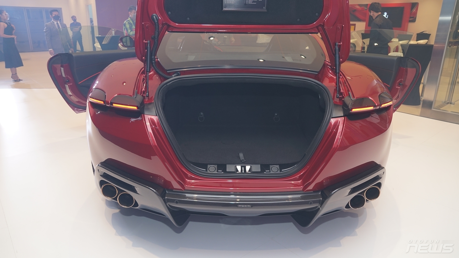 Nhìn từ sau, Ferrari Roma cho thấy dòng máu hiệu suất cao với hệ thống 4 ống xả tròn cỡ lớn bố trí đối xứng. Cụm đèn hậu cũng là điểm nhấn thú vị trên Roma với kiểu bóng tròn lạ mắt, đi kèm là dải đèn LED xi nhan giống trên đèn pha.