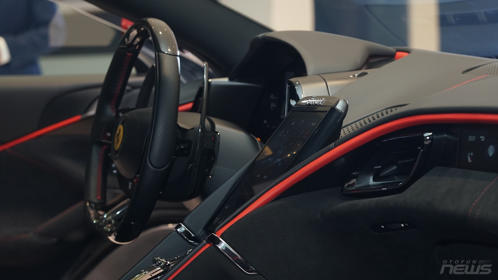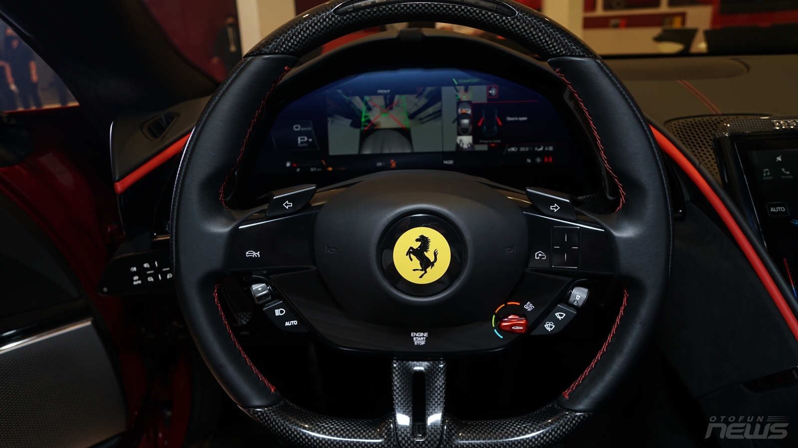 Ferrari Roma sử dụng vô lăng 3 chấu bọc da kết hợp vân carbon cùng chỉ đỏ mang đậm phong cách thể thao. Đi kèm là nhiều nút bấm tiện lợi, bao gồm cả nút khởi động. Nút Start/Stop, bảng điều hướng và đàm thoại rảnh tay được thay bằng cảm ứng, trong khi xi nhan, đèn pha và gạt mưa được tích hợp vào nút vật lý.