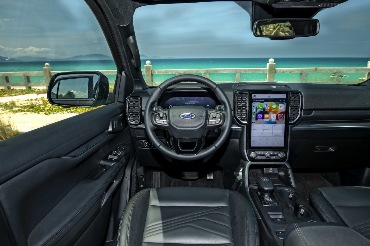 Ngoài ra điểm "ăn tiền" trên hệ thống cam này còn có thể hướng dẫn lái xe đặt bánh khi đi vào những nơi có địa hình khó, lái xe chỉ cần đánh vô lăng theo hướng dẫn hiển thị là có thể vượt qua chướng ngại vật 1 cách đơn giản. Không những thế trên phiên bản Titanium+ sẽ được trang bị cần số điện tử bọc da và phanh tay điện tử.
