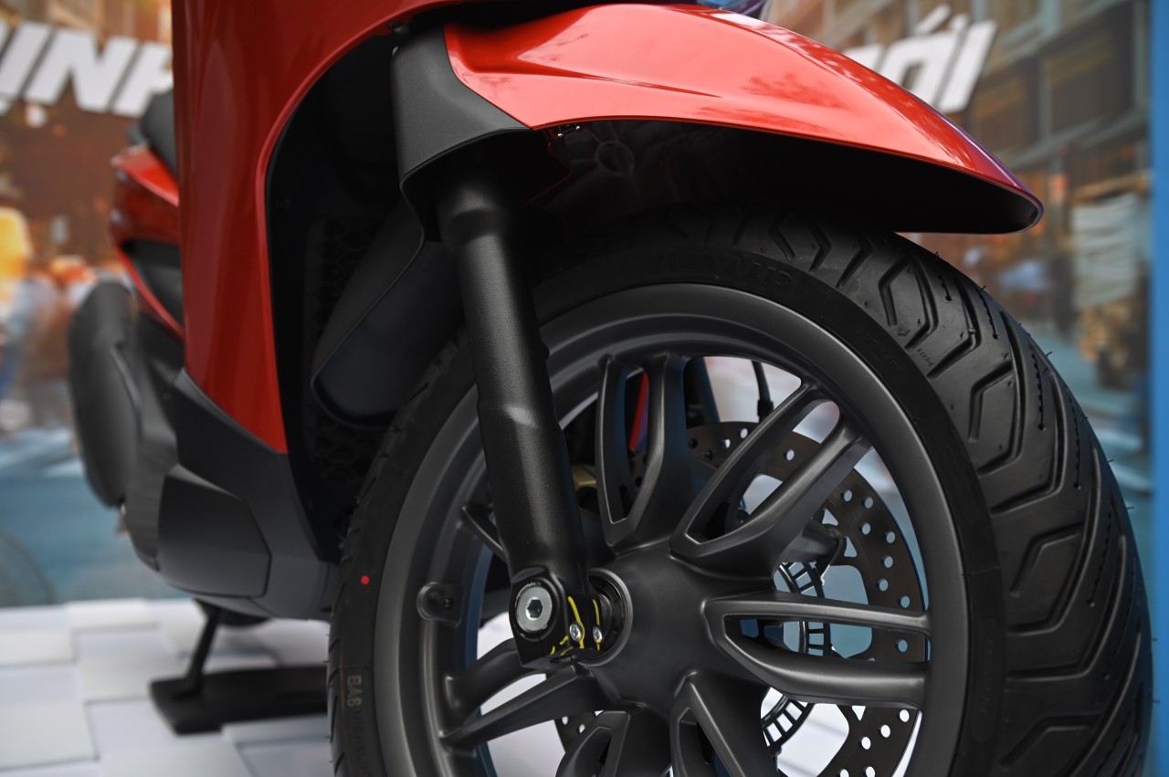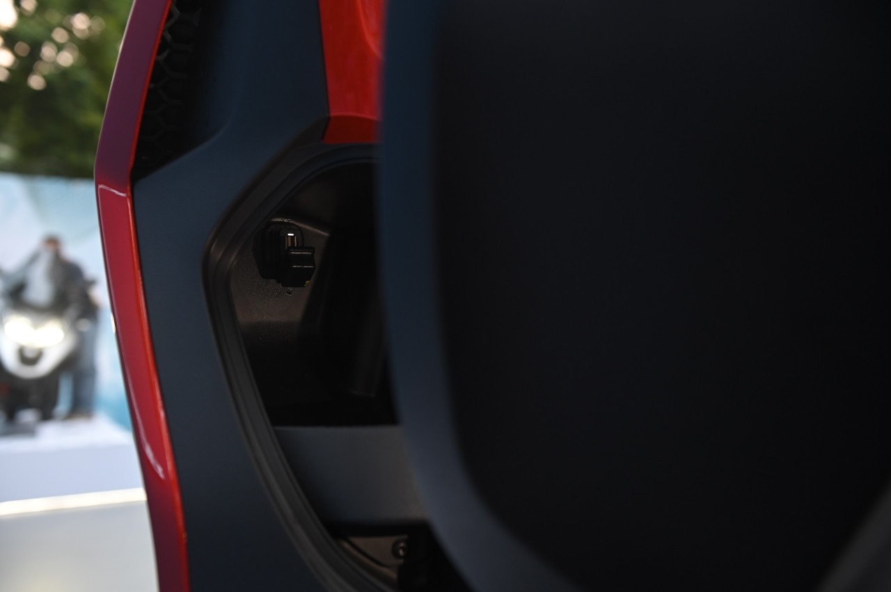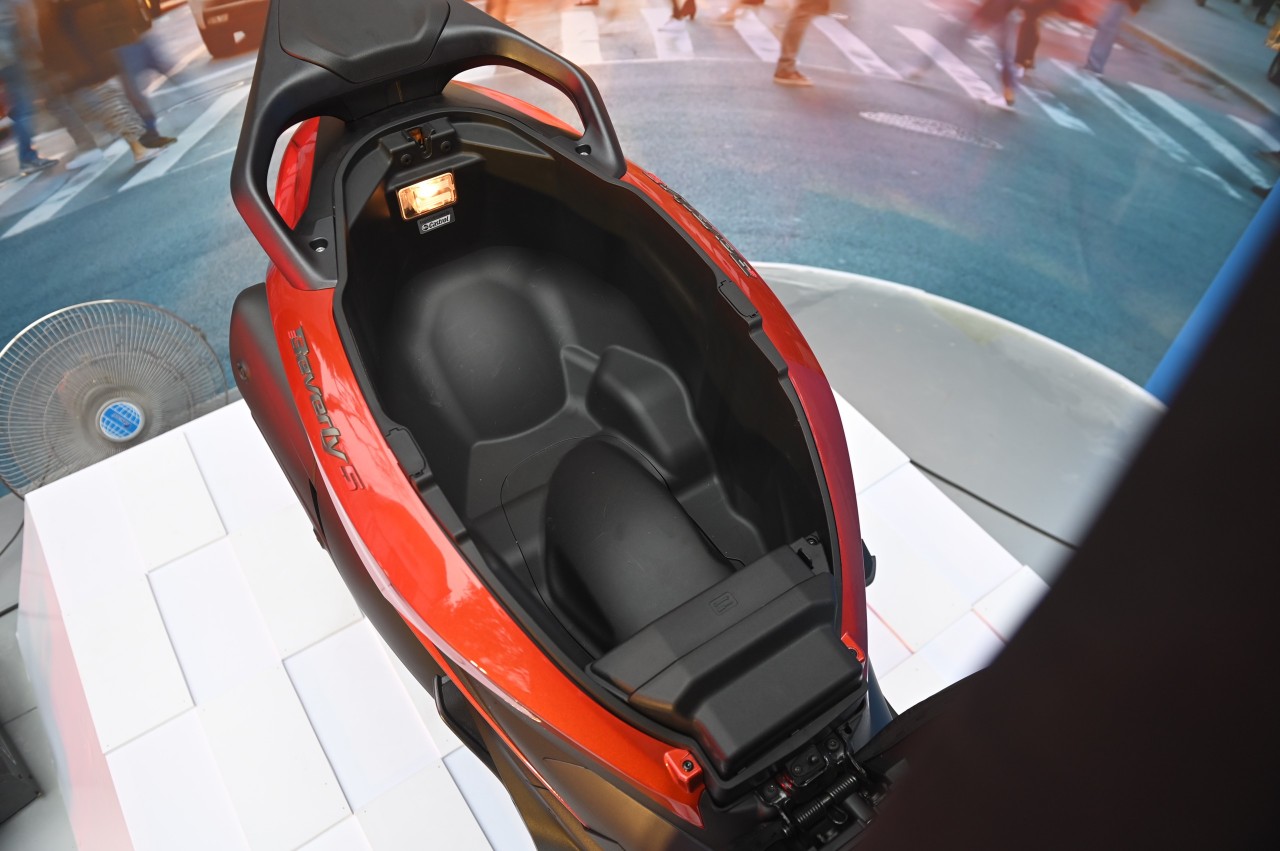 Vị trí bình xăng được đặt ở giữa sàn để chân không chỉ tiện lợi khi sử dụng, mà còn tạo cảm giác lái cân bằng hơn và giải phóng phần không gian dưới yên xe. Nhờ vậy, cốp xe lớn có thể chứa hai mũ bảo hiểm 3/4 và được trang bị thêm đèn chiếu sáng. Tay dắt sau kết hợp với giá đèo hàng; cốp trước tích hợp cổng sạc USB và móc treo đồ.