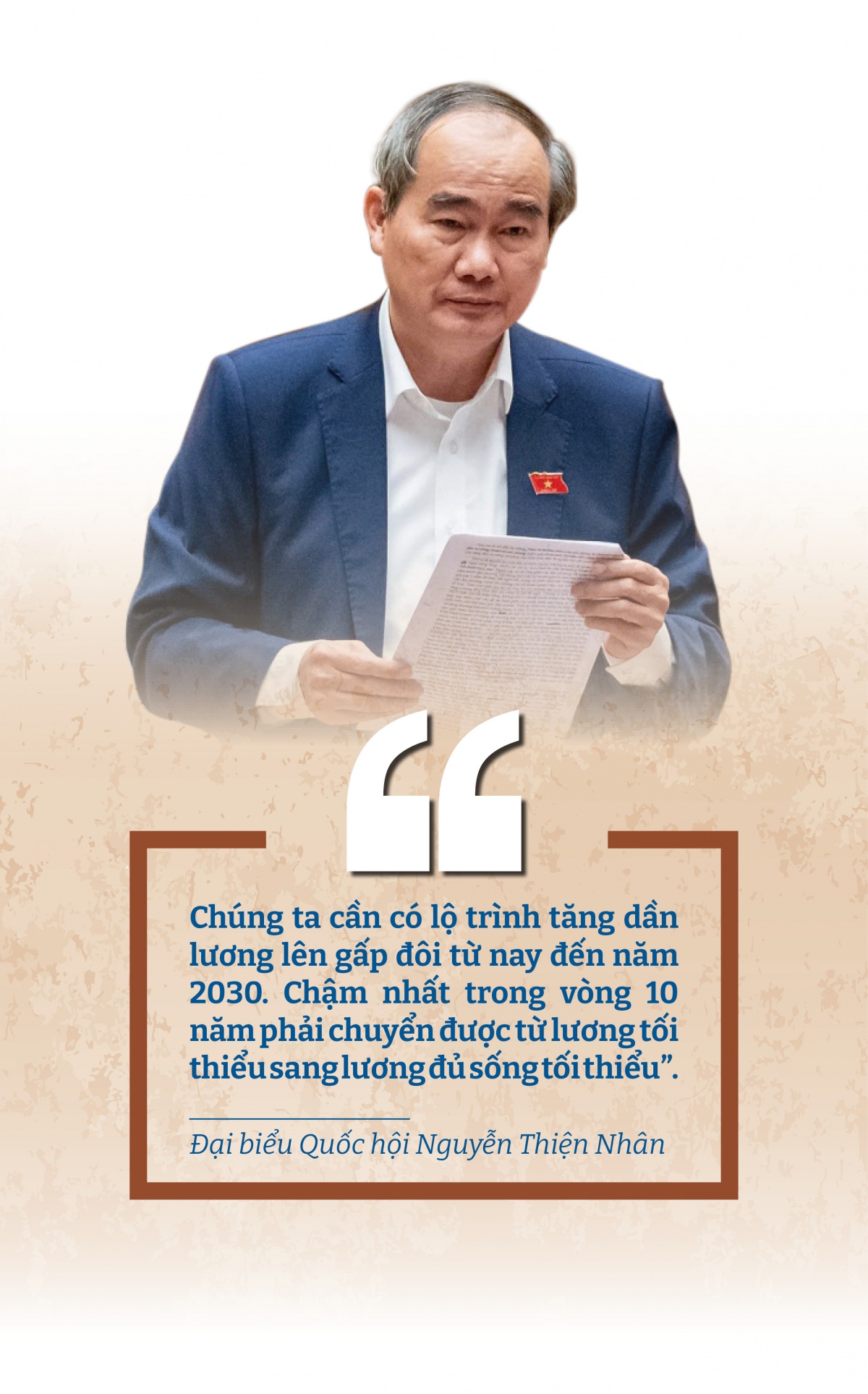 Mới đây, tại kỳ họp bất thường lần thứ 9 của Quốc hội, trong phiên thảo luận của Quốc hội về Đề án bổ sung phát triển kinh tế xã hội năm 2025 với mục tiêu tăng trưởng trên 8%, đại biểu Nguyễn Thiện Nhân (đoàn TP Hồ Chí Minh) đặt vấn đề về tiền lương, thu nhập phải đảm bảo đủ sống để người dân mạnh dạn sinh con. Với mức lương tối thiểu hiện nay, đại biểu Nguyễn Thiện Nhân cho rằng chỉ đủ trang trải cho người hưởng lương, còn không thể nuôi thêm con. Đại biểu cũng đề nghị cần có lộ trình chuyển từ lương tối thiểu sang lương đủ sống tối thiểu. Theo ông Nhân, hiện nay qua khảo sát, lương tối thiểu vùng 1 chỉ khoảng 5 triệu đồng/tháng. Trong khi đó, để một gia đình có hai người lao động nuôi được hai con, thu nhập cần đạt khoảng 21 triệu đồng/tháng. Điều này có nghĩa là lương đủ sống phải ở mức 10,5 triệu đồng/người/tháng. “Chúng ta cần có lộ trình tăng dần lương lên gấp đôi từ nay đến năm 2030. Chậm nhất trong vòng 10 năm phải chuyển được từ lương tối thiểu sang lương đủ sống tối thiểu”, ông Nhân nói. |
