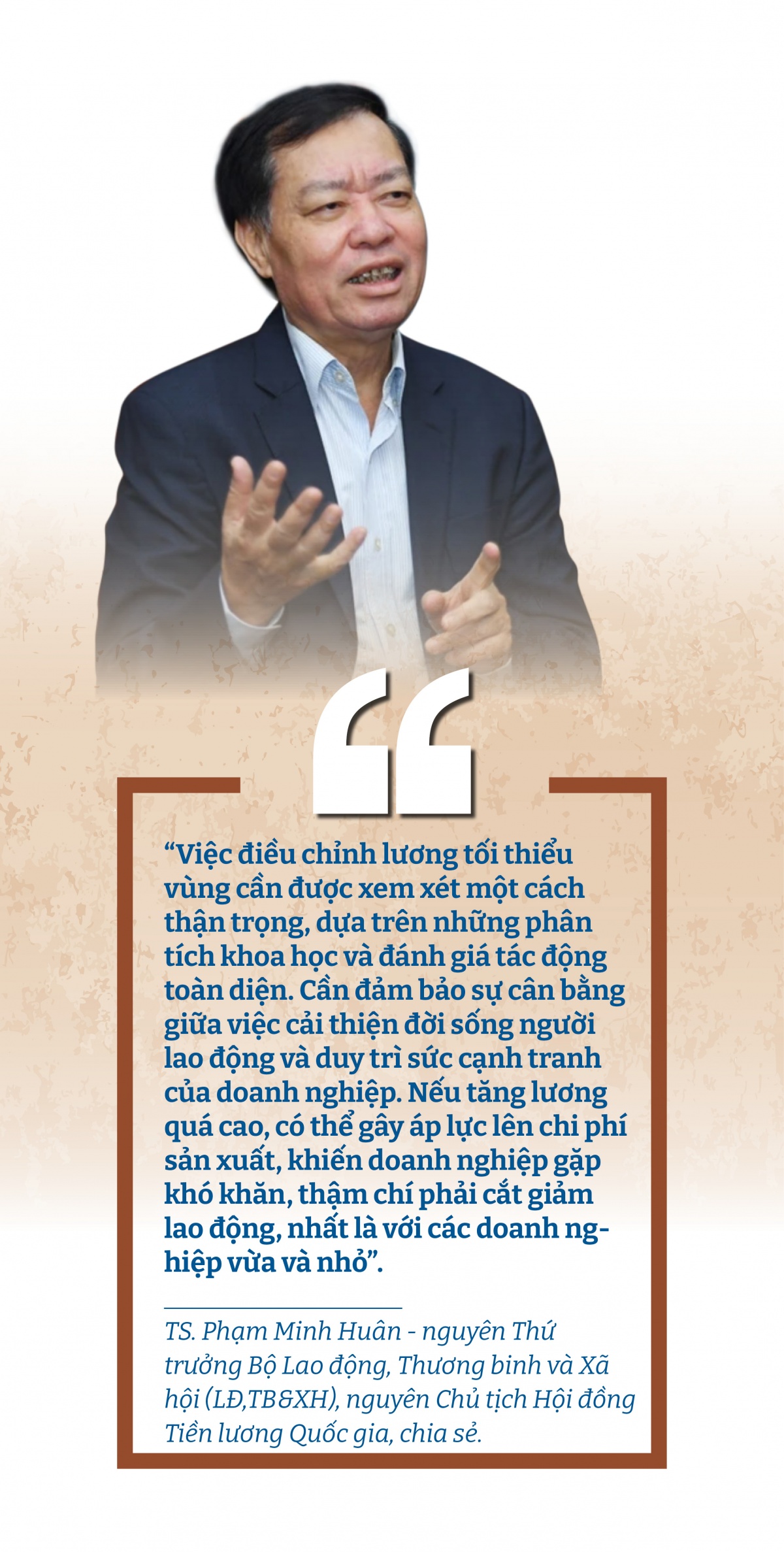 Với nhiều năm kinh nghiệm trong lĩnh vực lao động, tiền lương, TS. Phạm Minh Huân - nguyên Thứ trưởng Bộ Lao động, Thương binh và Xã hội (LĐ,TB&XH), nguyên Chủ tịch Hội đồng Tiền lương Quốc gia, chia sẻ: “Việc điều chỉnh lương tối thiểu vùng cần được xem xét một cách thận trọng, dựa trên những phân tích khoa học và đánh giá tác động toàn diện. Cần đảm bảo sự cân bằng giữa việc cải thiện đời sống người lao động và duy trì sức cạnh tranh của doanh nghiệp. Nếu tăng lương quá cao, có thể gây áp lực lên chi phí sản xuất, khiến doanh nghiệp gặp khó khăn, thậm chí phải cắt giảm lao động, nhất là với các doanh nghiệp vừa và nhỏ”. |