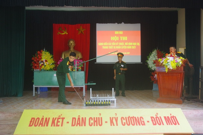 | "Cây sáng kiến" - Trung tá QNCN Bùi Đình Hướng đang thuyết minh sáng kiến tại Hội thi sáng kiến cải tiến trang thiết bị huấn luyện Kho K63. Ảnh: CĐQP |