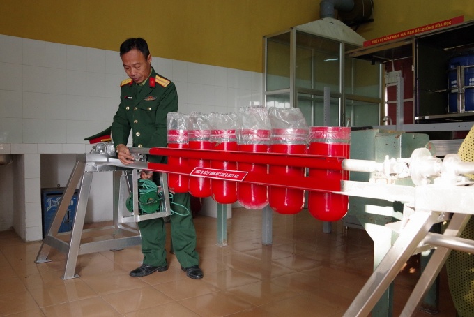 Trung tá Bùi Đình Hướng kiểm tra, lắp đặt giá đỡ bình xịt khí cay BX-4 vào thiết bị xử lý. Ảnh: CĐQP |