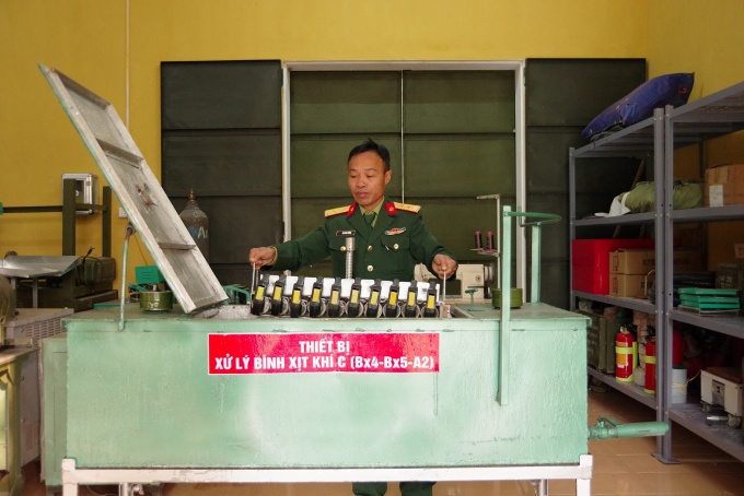 | Trung tá Bùi Đình Hướng lắp đặt mô tơ tạo lực rung cho thiết bị xử lý bình bột BX-7. Ảnh: CĐQP |
