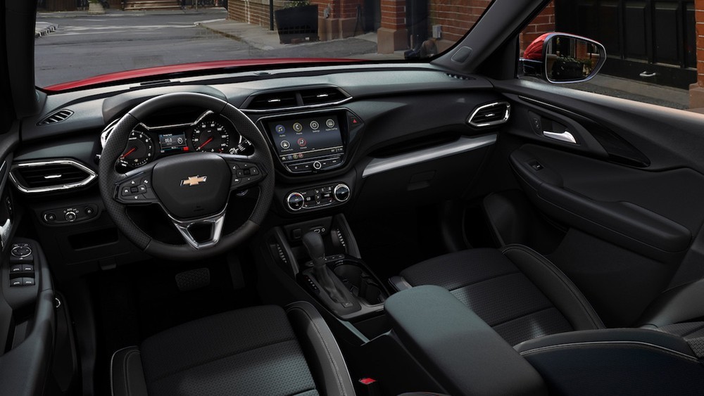 Bên trong Chevrolet Trailblazer 2022, không gian nội thất toát lên vẻ thể thao với trang bị màu đen tuyền cùng những điểm nhấn mạ crôm giả ở cửa gió điều hòa, tay nắm cửa trên mặt táp-lô, vô lăng bọc da cũng như núm chỉnh điều hòa.