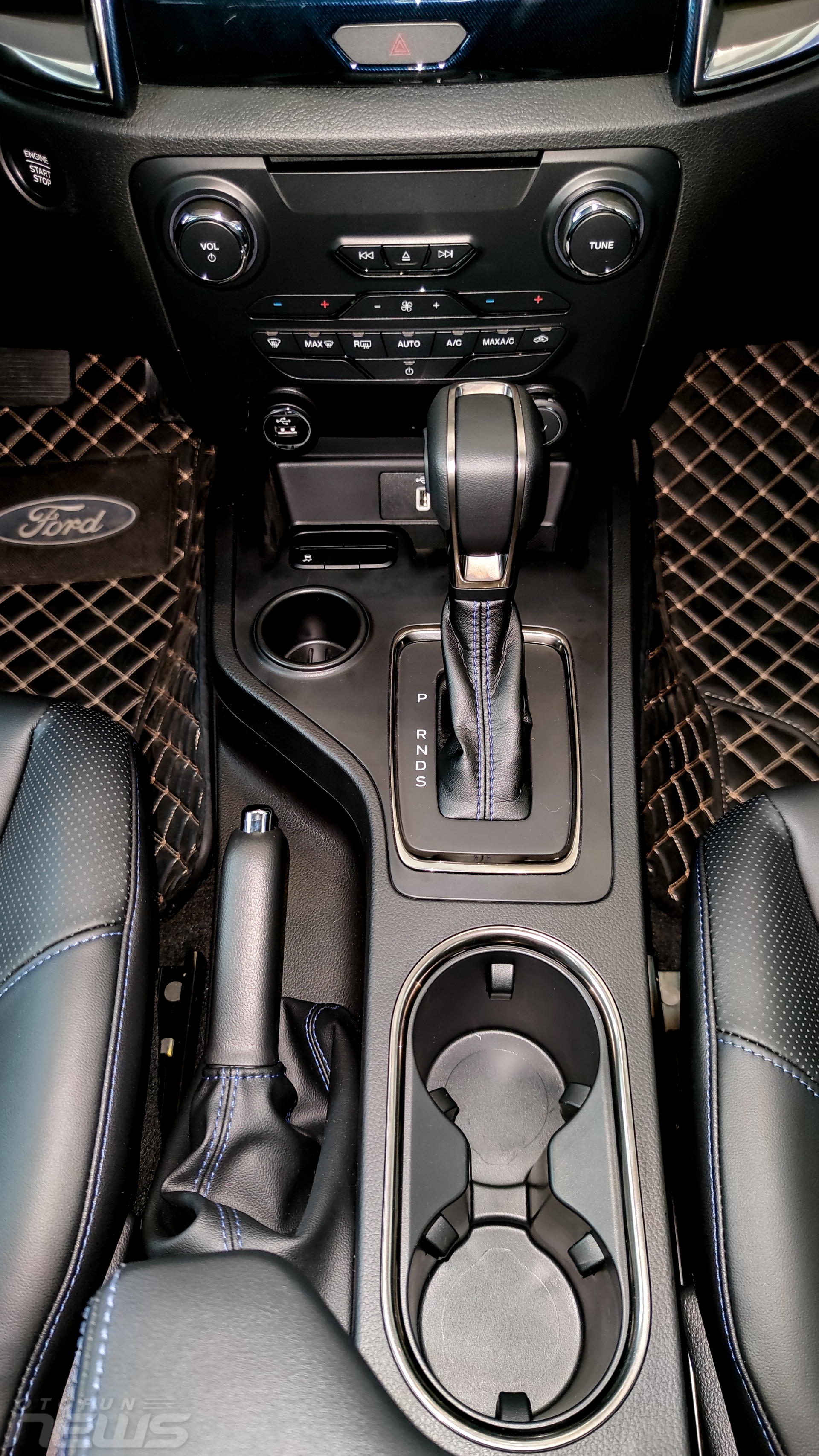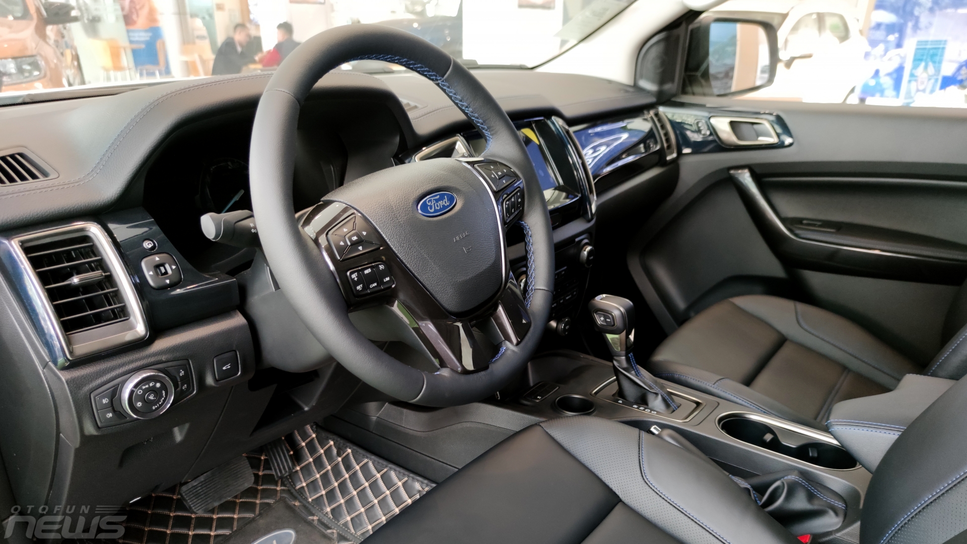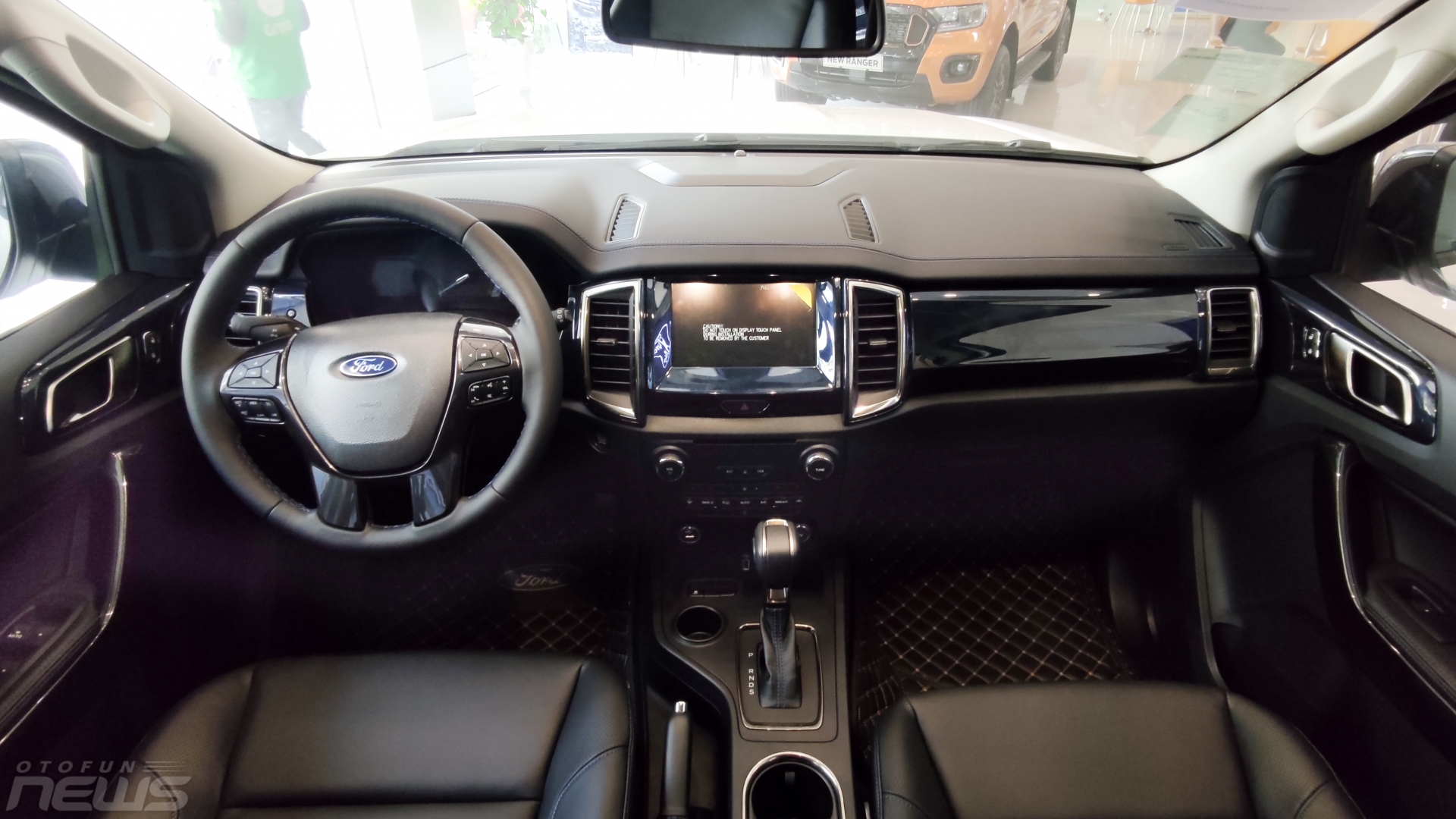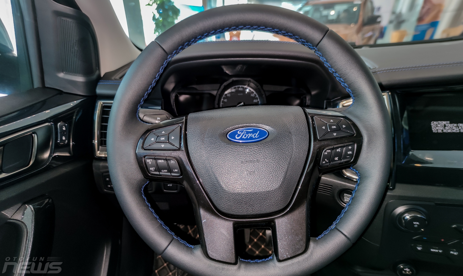 Bên trong cabin, Ford Everest Sport 2021 mang đến cảm giác quen thuộc, bởi thiết kế gần như giữ nguyên so với phiên bản cũ ra mắt cách đây 3 năm. Phiên bản Sport được trang bị nội thất da đen với những đường chỉ khâu màu xanh lam. Vô lăng được bọc da với những đường chỉ khâu xanh nổi bật với nhiều nút bấm như kiểm soát hành trình, giới hạn tốc độ, đàm thoại rảnh tay, ra lệnh bằng giọng nói....Phía sau là cụm đồng hồ Analog kết hợp hai màn hình đa thông tin quen thuộc đúng phong cách những chiếc SUV.
