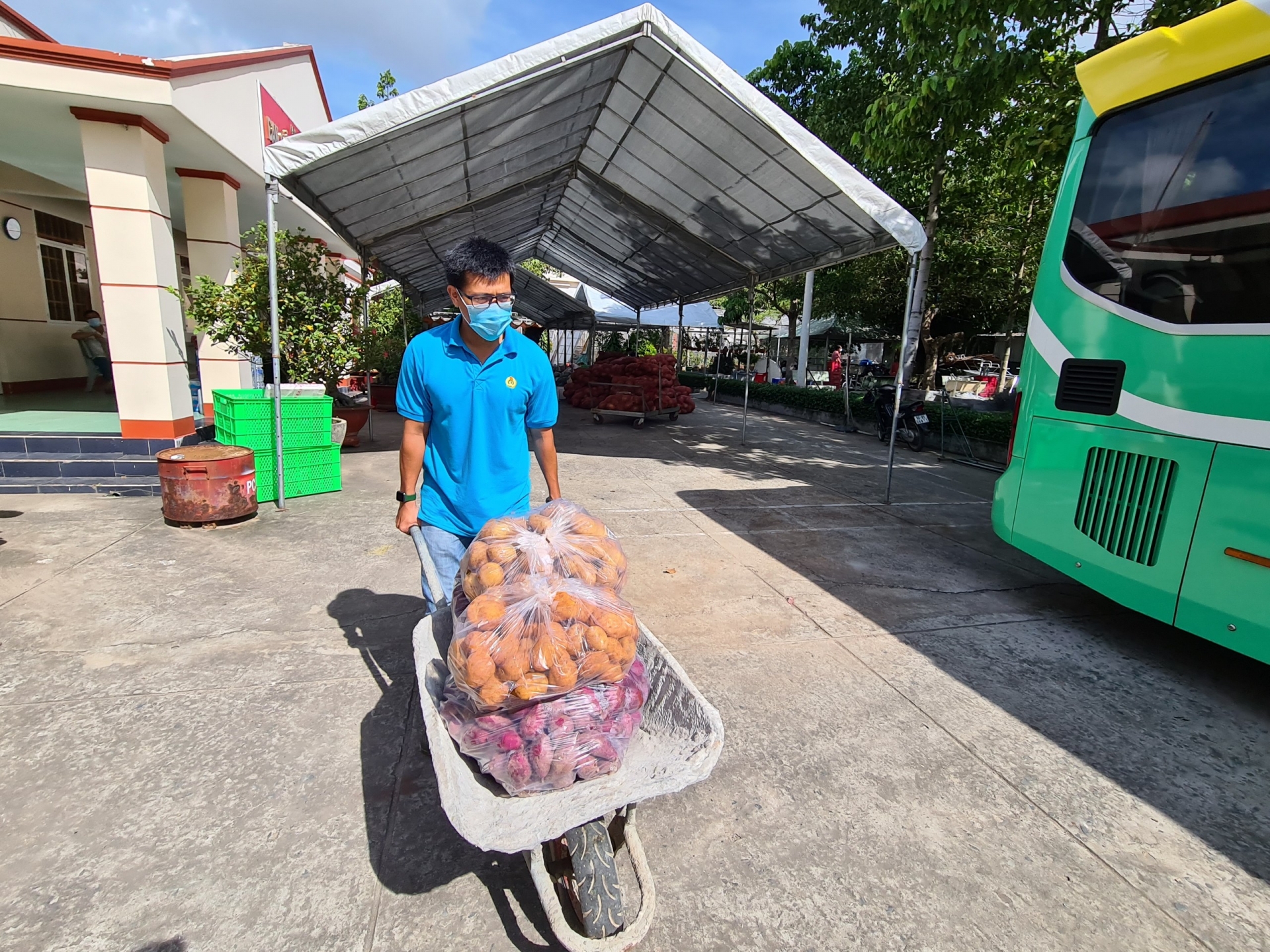 Vận chuyển thực phẩm từ xe ô tô về nơi tập kết - Ảnh: H.Trung