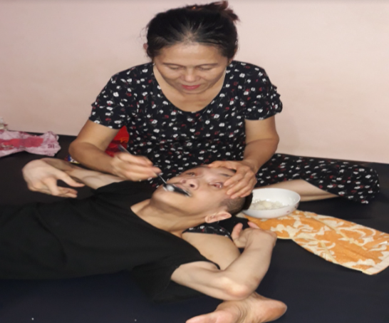 | Chị Mai Thị Hiền chăm sóc đứa con đầu lòng tàn tật. |