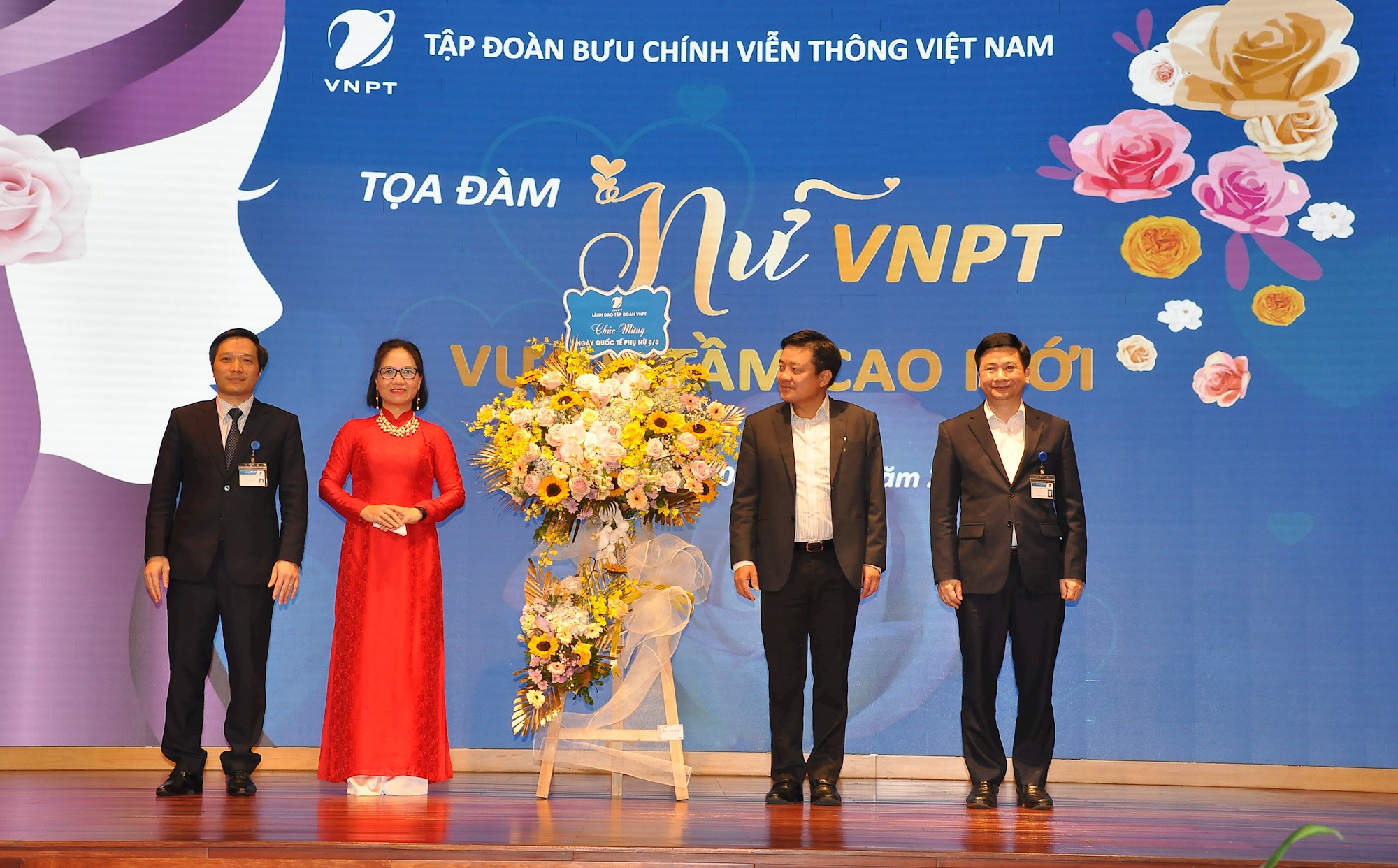 Lãnh đạo Tập đoàn và Công đoàn VNPT tặng hoa chúc mừng các diễn giả. Ảnh: Công đoàn VNPT