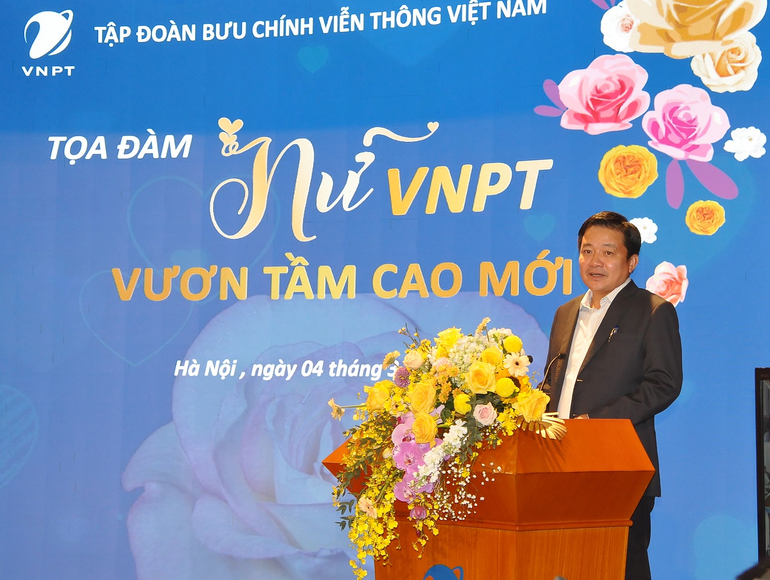 | Tổng Giám đốc Tập đoàn VNPT Huỳnh Quang Liêm tặng hoa cho chị em phụ nữ Tập đoàn VNPT nhân ngày Quốc tế Phụ nữ 8/3. Ảnh: Công đoàn VNPT |
