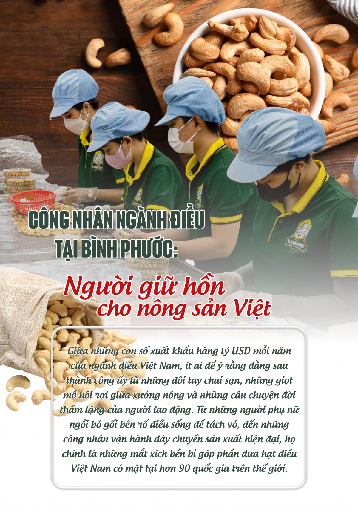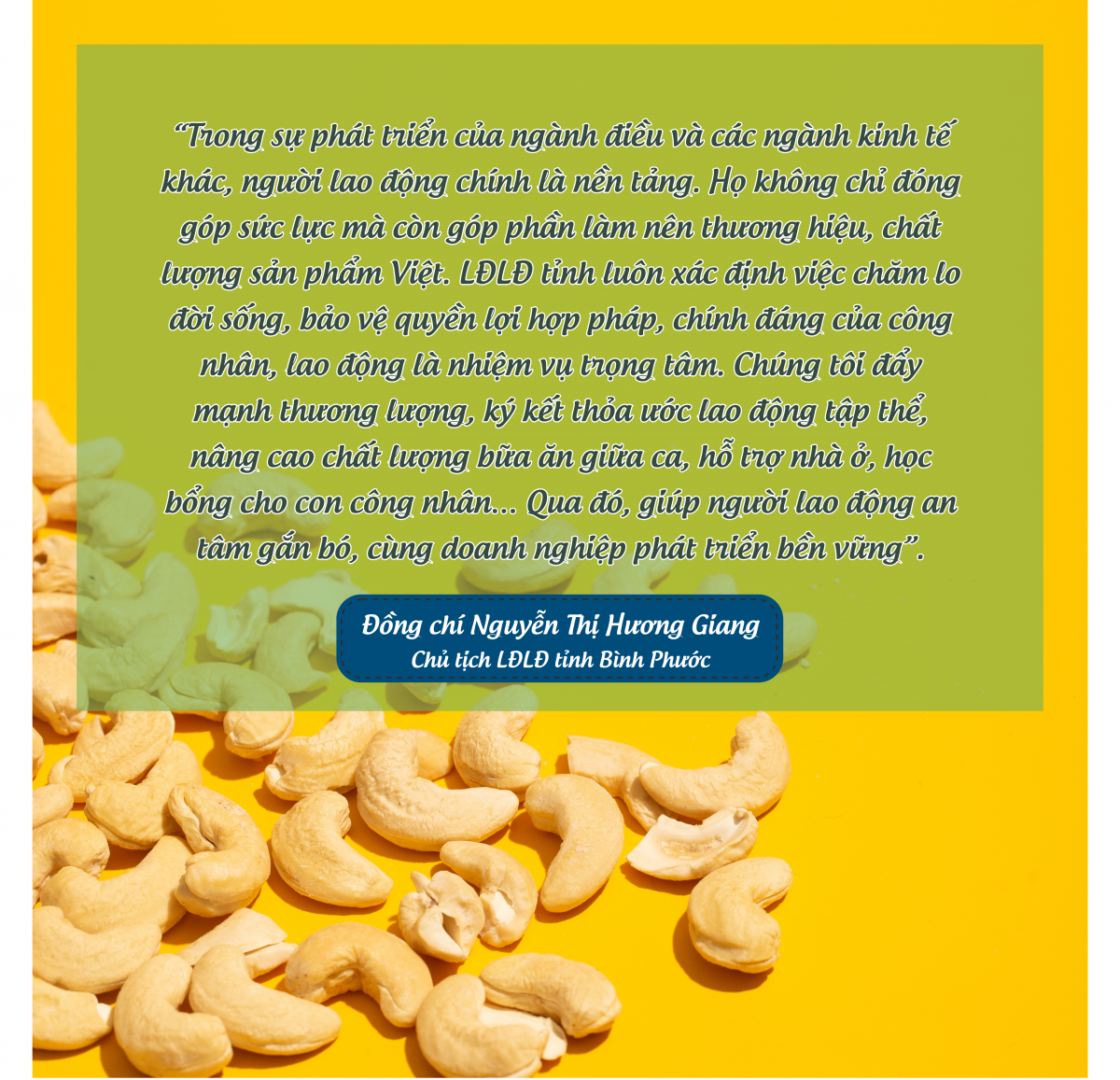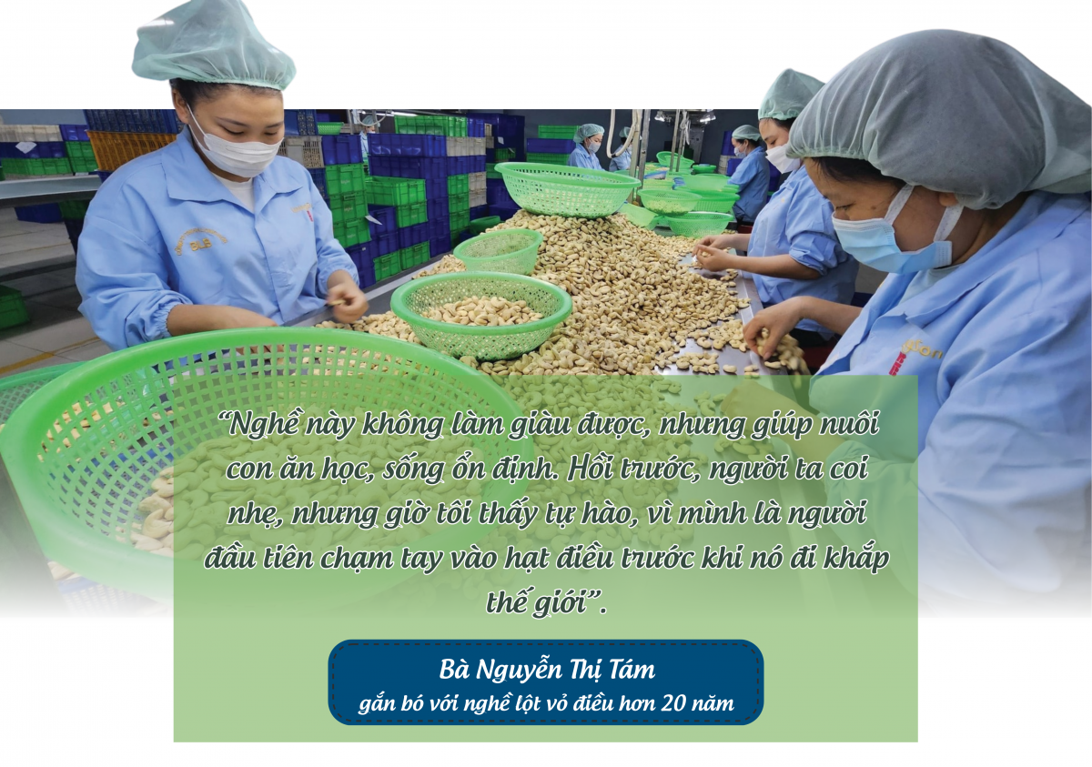 Ngành điều hiện nay đang tạo việc làm cho hàng chục ngàn lao động trực tiếp và hàng trăm ngàn lao động gián tiếp, chủ yếu là phụ nữ và người lao động ở nông thôn. Nhờ nghề điều, nhiều vùng quê ở Bình Phước, Đồng Nai, Long An… thay da đổi thịt. Người lao động có thu nhập ổn định, được đóng bảo hiểm xã hội, được công đoàn chăm lo đời sống. Trong hành trình vươn ra thế giới của hạt điều Việt, không thể thiếu vai trò bền bỉ của tổ chức Công đoàn. Từ các vùng nguyên liệu đến nhà máy chế biến, Công đoàn các cấp đã nỗ lực tạo dựng môi trường làm việc ổn định, an toàn và bảo vệ quyền lợi chính đáng cho người lao động.