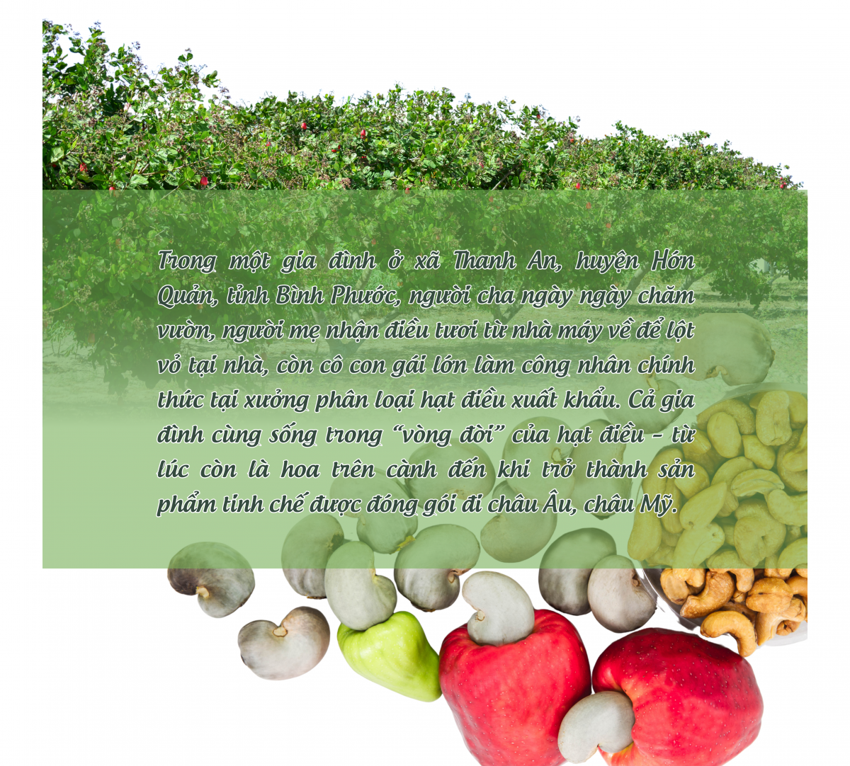 Việt Nam bắt đầu trồng điều từ những năm 1980, khi cây điều được xem như một “giải pháp sinh kế” cho vùng đất khô cằn miền Đông Nam Bộ. Lúc ấy, hạt điều chủ yếu được xuất thô, giá trị thấp, và hoàn toàn phụ thuộc vào thị trường nước ngoài. Nhưng chỉ sau hơn 40 năm, Việt Nam đã trở thành quốc gia xuất khẩu điều nhân lớn nhất thế giới – chiếm trên 80% thị phần toàn cầu về điều nhân xuất khẩu. Trong số đó, Bình Phước được xem là “thủ phủ điều” của Việt Nam với diện tích hơn 152.000 ha, chiếm gần 50% diện tích điều của cả nước. Năm 2024, kim ngạch xuất khẩu điều nhân của tỉnh Bình Phước ước đạt 1,743 triệu USD, đóng góp quan trọng vào tăng trưởng kinh tế của địa phương. Sự tăng trưởng của ngành không phải chỉ dựa vào máy móc hay công nghệ nhập khẩu, mà còn nhờ vào lao động lành nghề, chịu khó. Ở nhiều vùng đất đỏ như Bình Phước, Đồng Nai, Đắk Lắk…, không hiếm những gia đình mà cả ba thế hệ đều sống nhờ cây điều.