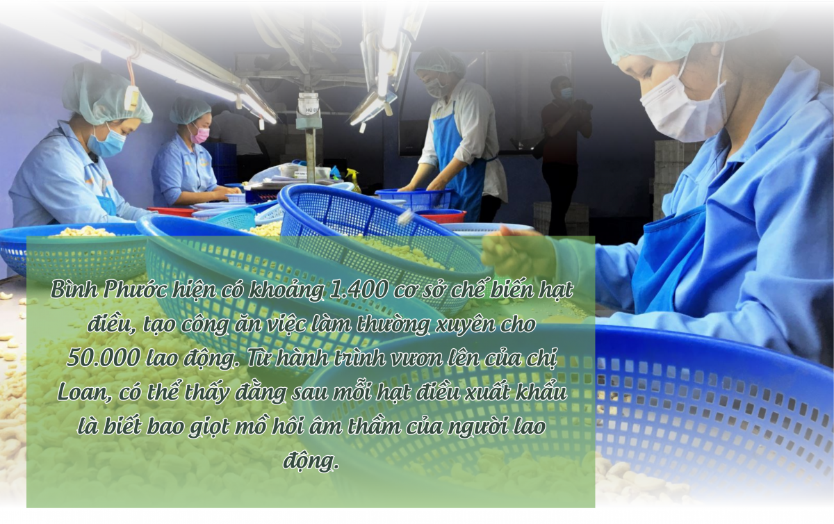 Năm 2022, sản phẩm của chị đạt chuẩn OCOP 4 sao của tỉnh. Hiện chị điều hành doanh nghiệp hơn 20 lao động, lương 6–12 triệu đồng/người/tháng, trong đó có 5 người chuyên phụ trách kênh Facebook. “Quan trọng không phải mình xuất thân thế nào, mà là dám nghĩ, dám làm, dám đứng dậy sau vấp ngã”, chị Loan chia sẻ. Bình Phước hiện có khoảng 1.400 cơ sở chế biến hạt điều, tạo công ăn việc làm thường xuyên cho 50.000 lao động. Từ hành trình vươn lên của chị Loan, có thể thấy đằng sau mỗi hạt điều xuất khẩu là biết bao giọt mồ hôi âm thầm của người lao động. Từ những người phụ nữ ngày ngày lột vỏ điều bằng tay, hứng chịu nhựa cay xé da, đến đội ngũ công nhân trong nhà máy túc trực bên dây chuyền hấp, rang, đóng gói… tất cả đều là mắt xích quan trọng trong chuỗi sản xuất. Họ không chỉ cần mẫn với từng công đoạn mà còn liên tục học hỏi kỹ thuật mới, góp phần nâng cao chất lượng sản phẩm. Chính những đôi tay thô ráp ấy đã tạo nên những hạt điều thơm ngon, đậm đà hương vị Việt, chinh phục thị trường trong và ngoài nước. |