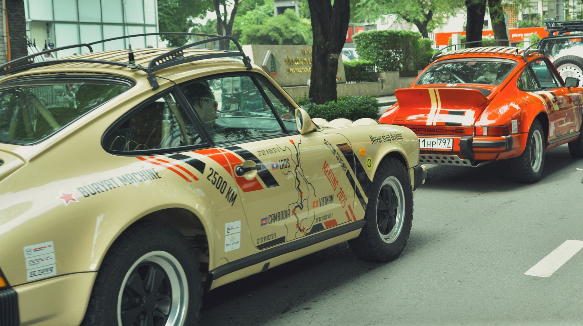 Bên cạnh đó là những chiếc Porsche 911 G-Modell được độ lại để phù hợp với địa hình khắc nghiệt. Dòng xe này từng là biểu tượng của Porsche trong thập niên 1970-1980, với phần cản trước bọc cao su dày đặc trưng. Một số xe trong đoàn còn được nâng cấp khung gầm và lốp địa hình, gợi nhớ đến phong cách “Safari 911”.