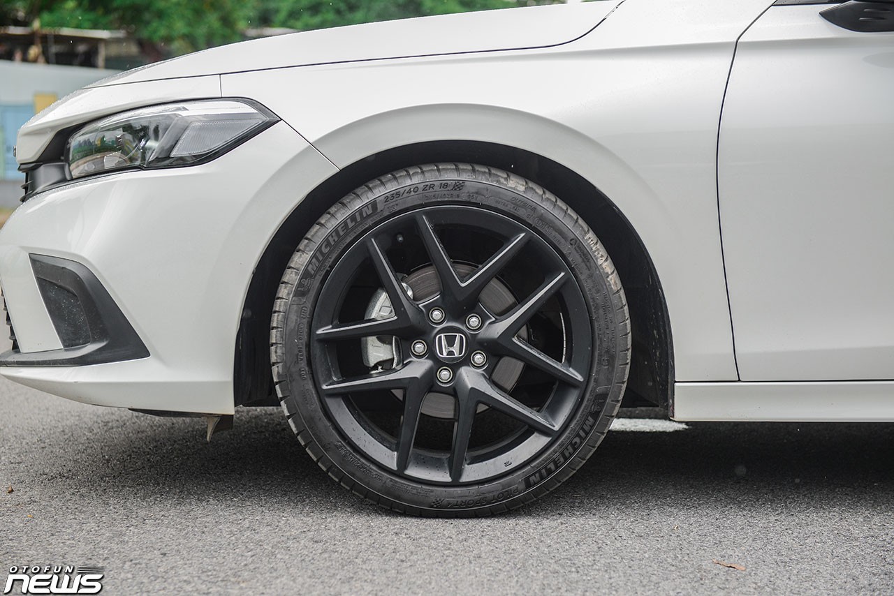 Tuy nhiên, phiên bản Civic RS không vì thế mà thiếu đi sự năng động, thể thao vốn có. Nhìn ngang thân, phần mui xe từ cột C được kéo dài ra phía sau. Điều này giúp chiếc xe mang hơi hướng của một chiếc coupe thể thao thay vì sedan truyền thống. Gói bodykit RS tạo nên điểm nhấn rõ nét. Lưới tản nhiệt, cản trước, cản sau, ốp gương, cánh gió đuôi, ăng ten vây cá sơn đen tương phản. Logo RS ở đầu và đuôi xe cũng là điểm nhấn không thể bỏ qua. Đặc biệt mâm xe 5 chấu kép kích thước 18 inch sơn đen, đi cùng đó là lốp Michelin Pilot sport kích cỡ 235/40 zr18. Đây là bộ lốp có độ bám tốt hàng đầu trong phân khúc, thậm chí bộ lốp này còn được trang bị trên xe hiệu năng cao.