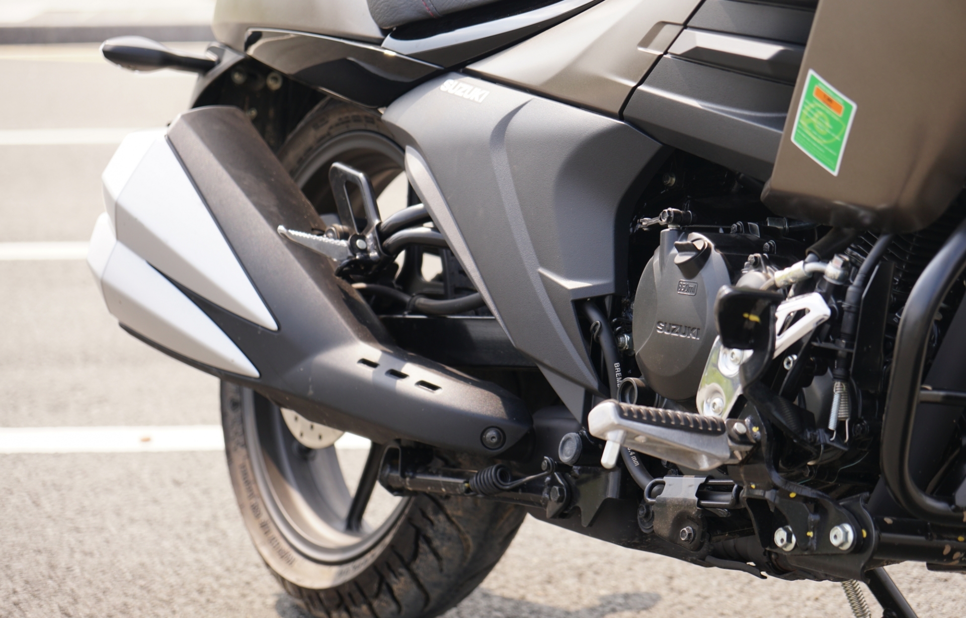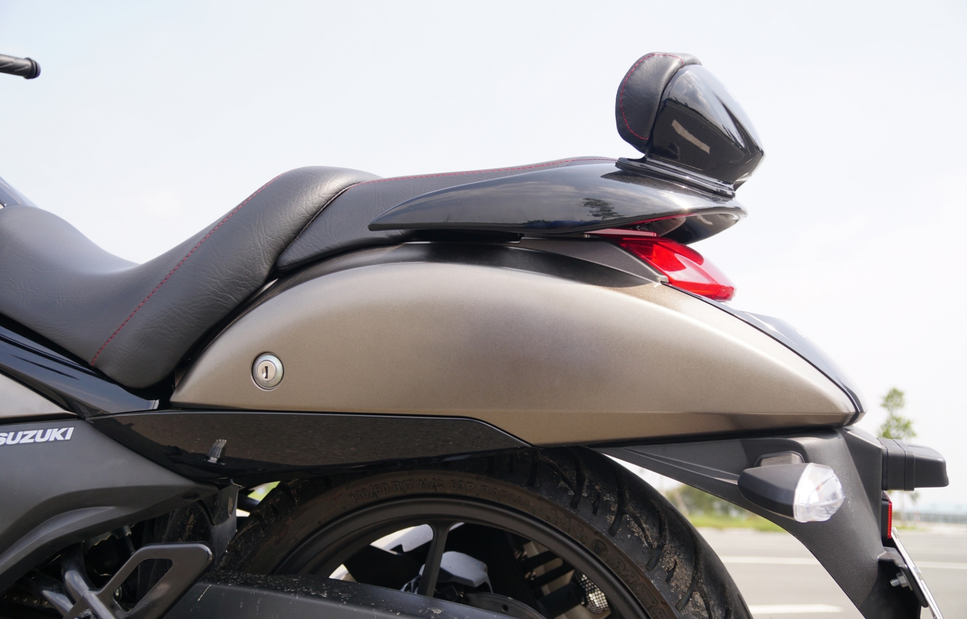 Phần hông của Intruder 150 nổi bật với bộ quây tạo hình cơ bắp, tăng tính hiện đại và cảm giác to lớn, hầm hố cho xe. Ngay phía dưới là bộ ống xả 2 đầu ốp dạng lục giác mạ bạc – chi tiết phần nào mang hơi hướng của mẫu Intruder M1800R cỡ lớn – mang đến ấn tượng hầm hố đặc trưng của những mẫu cruiser cổ điển.