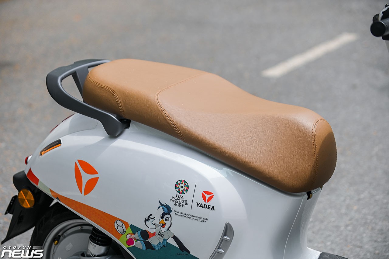 Tương phản với tone trắng chủ đạo, yên xe Yadea Orla 2023 mang màu nâu sáng, có thiết kế khá dày dặn, bề mặt yên lớn, kết hợp với khoảng để chân rộng rãi tạo tư thế ngồi rất thoải mái cho khách hàng.