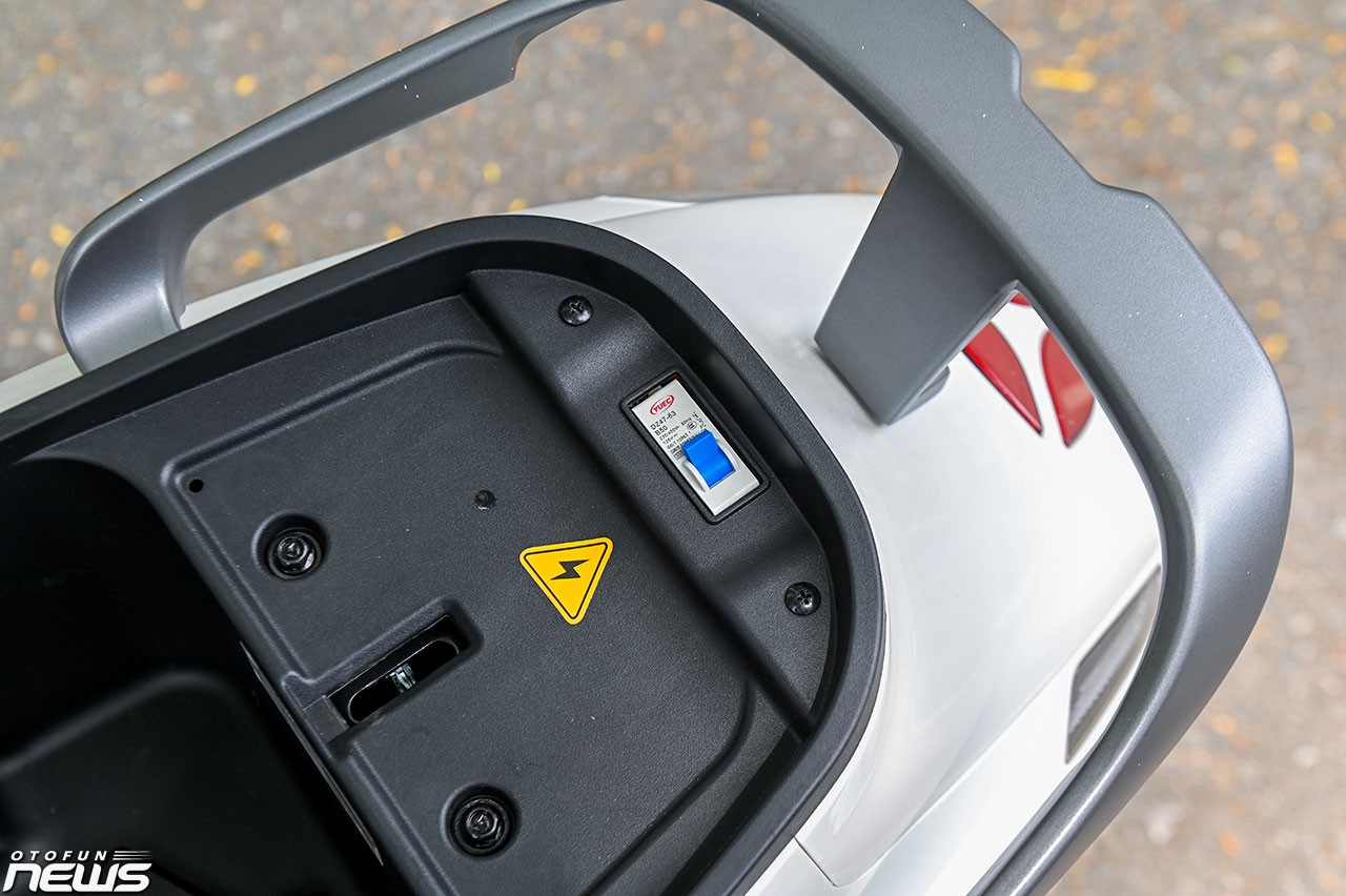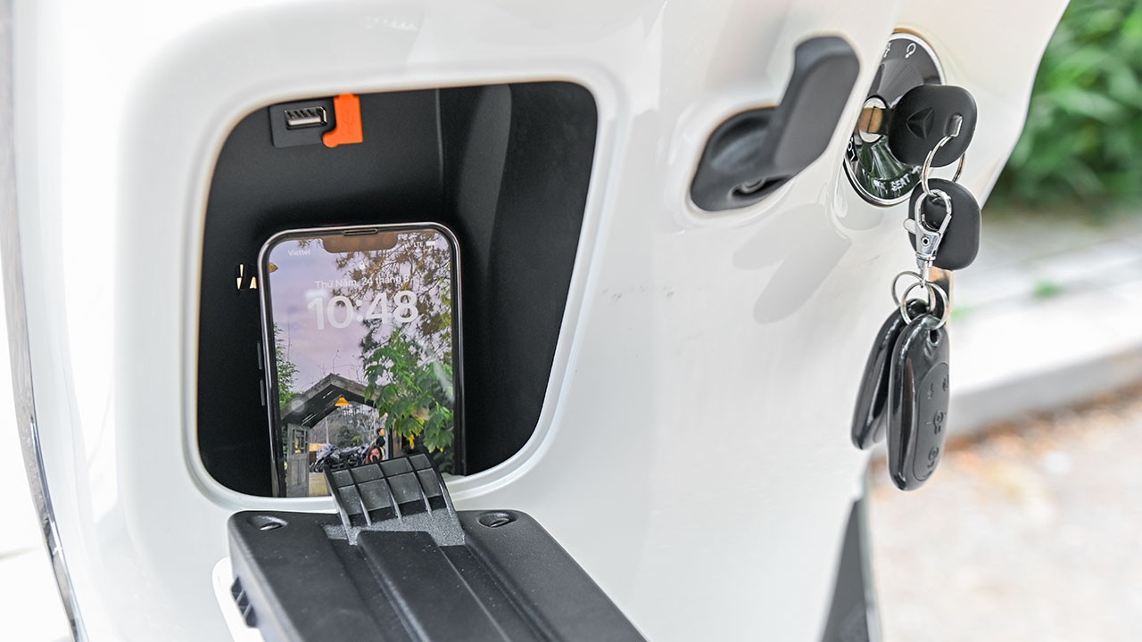 Vị trí để đồ thứ hai ở giữa xe, có móc treo đồ tiện lợi. Không gian này được thiết kế vừa là chỗ để chân, kết hợp treo đồ. Vị trí thứ ba là hộc đựng đồ ẩn dưới mặt nạ xe, có tích hợp cổng sạc USB bên trong giúp khách hàng có thể sạc pin điện thoại ngay khi đi trên đường.