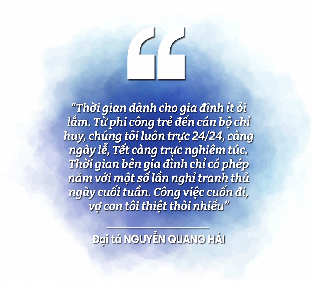 “Thời gian dành cho gia đình ít ỏi lắm.” Anh bất giác thở dài - Từ phi công trẻ đến cán bộ chỉ huy, chúng tôi luôn trực 24/24, càng ngày lễ, Tết càng trực nghiêm túc. Thời gian bên gia đình chỉ có phép năm với một số lần nghỉ tranh thủ ngày cuối tuần. Công việc cuốn đi, vợ con tôi thiệt thòi nhiều. |