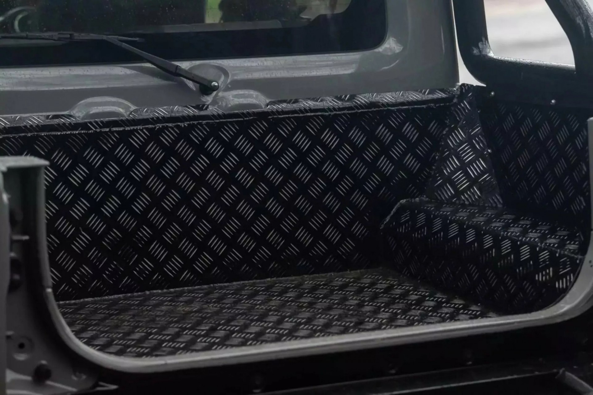 Để tạo ra chiếc Suzuki Jimny 6 bánh, Mocho Fabrication đã kéo dài thân xe, bổ sung thêm một trục thứ ba ở phía sau và trang bị 6 lốp địa hình chắc chắn. Phần ngoại thất được cải tiến với hai vè chắn bùn mới, thùng chở đồ phía sau kèm cửa hậu thiết kế riêng, trong khi cản sau và đèn hậu được giữ nguyên từ phiên bản gốc. Nhìn tổng thể, chiếc xe mang phong cách mạnh mẽ, gợi liên tưởng đến “tiểu Mercedes-AMG G63 6x6” – mẫu SUV địa hình hạng sang nổi tiếng của Đức.