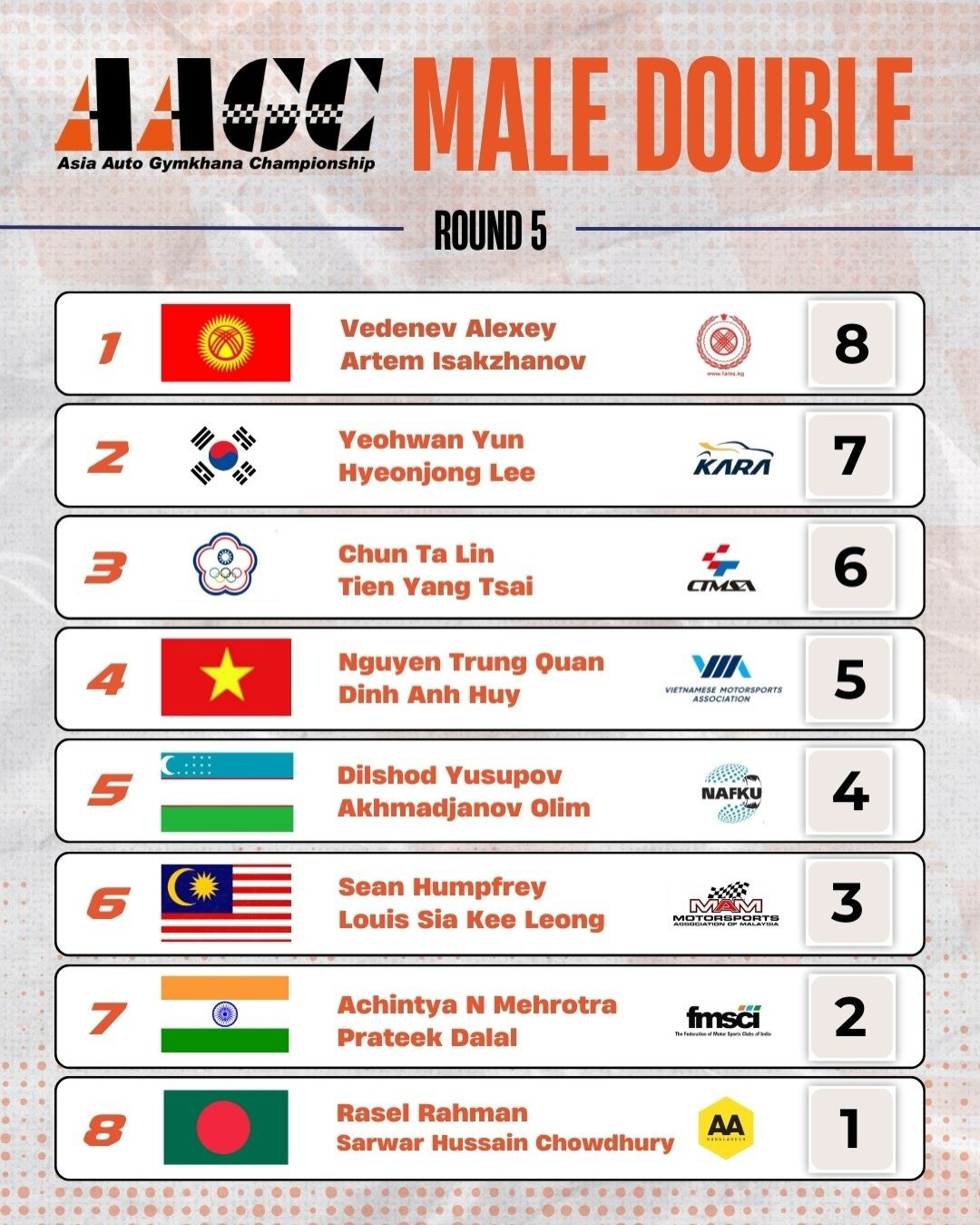 Đáng chú ý hơn là thành tích ở nội dung Male Double, nơi đội Việt Nam lọt vào top 4 chung cuộc. Đây là hạng mục yêu cầu sự phối hợp chặt chẽ giữa hai tay đua trong bối cảnh thời gian thi đấu ngắn và sai số gần như không được phép. Kết quả này giúp Việt Nam liên tục mang điểm về cho bảng xếp hạng ASN trong suốt mùa giải.