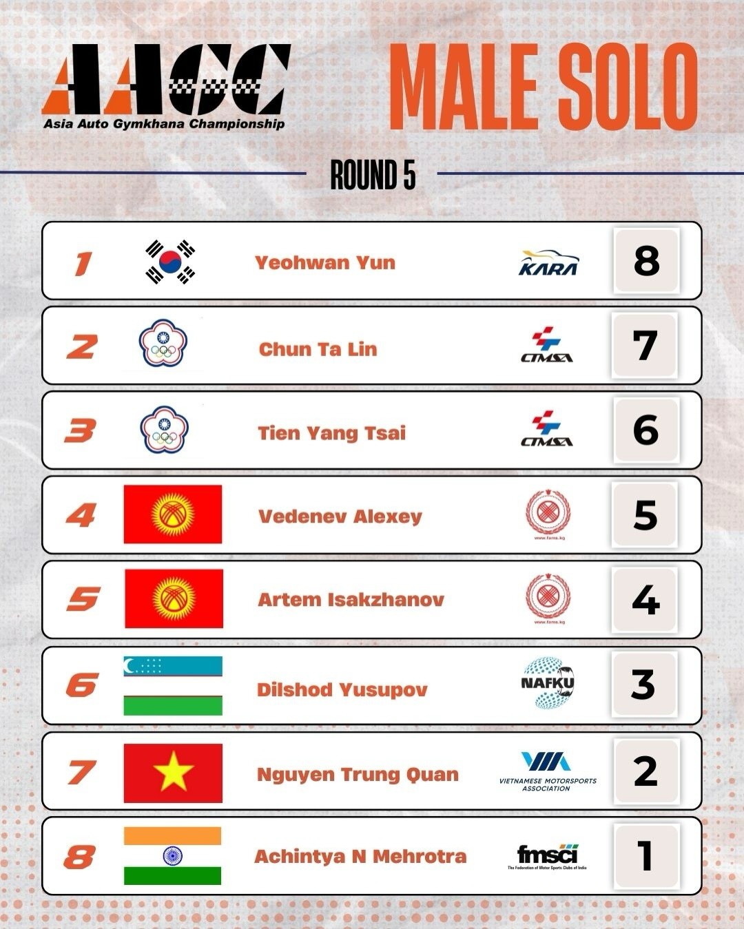 Ở nội dung Male Solo, Nguyễn Trung Quân kết thúc mùa giải trong top 7 chung cuộc. Đinh Anh Huy xếp hạng 13, một kết quả phản ánh sự thích nghi nhanh với xe thi đấu, mặt sân và bài thi có độ biến thiên cao. Với đặc thù Gymkhana đòi hỏi khả năng đọc bài chính xác và kiểm soát xe ở giới hạn thấp, việc duy trì sự ổn định qua nhiều vòng được đánh giá là yếu tố then chốt, đặc biệt với các tay đua đến từ nền motorsport còn non trẻ.