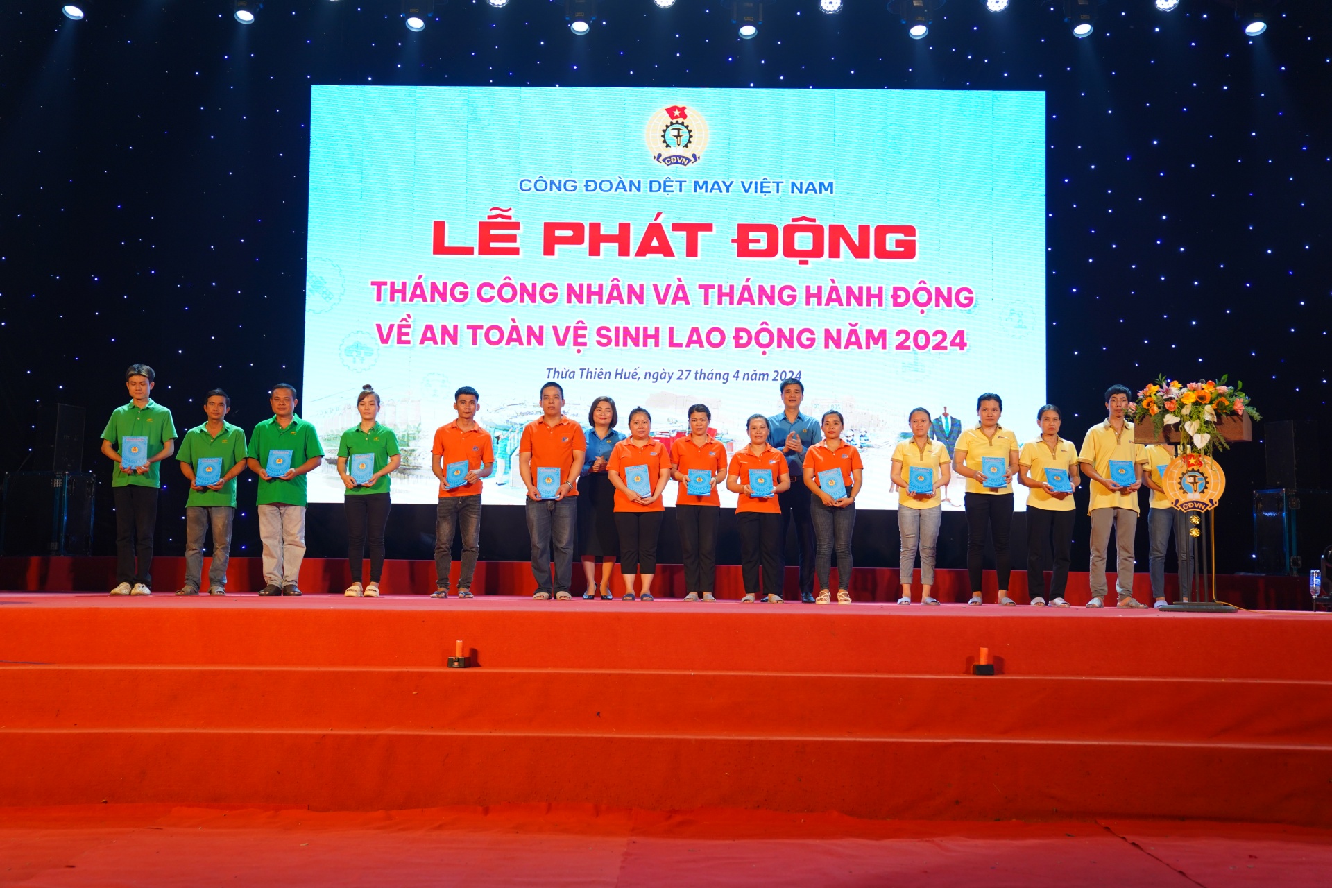 Đồng chí Ngọ Duy Hiểu - Phó Chủ tịch Tổng LĐLĐ Việt Nam trao quà cho công nhân ngành Dệt May có hoàn cảnh khó khăn tại lễ phát động Tháng Công nhân và Tháng hành động về ATVSLĐ năm 2024. Ảnh: CĐ DM