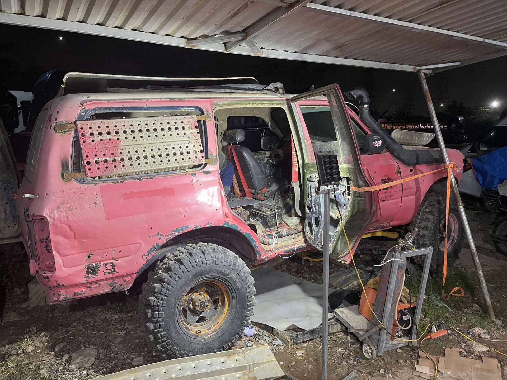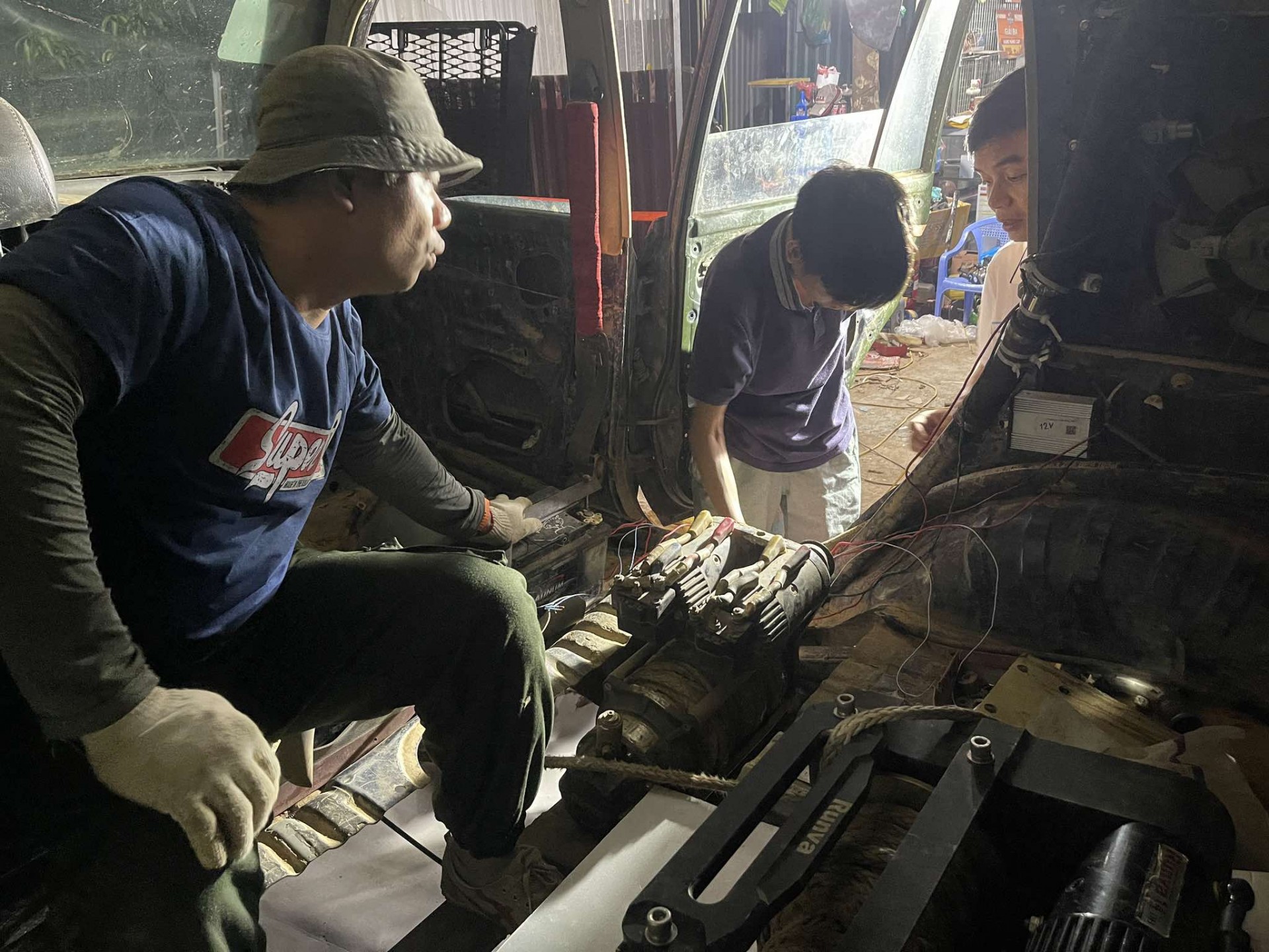 Tiếp đến chúng tôi đến một xưởng độ xe khác, nơi mà niềm đam mê với tốc độ đã biến thành động lực phi thường, bất chấp khó khăn về tài chính và thời gian. Khi chúng tôi đến đây, đồng hồ đã điểm 9 giờ tối, nhưng không khí trong xưởng vẫn rất náo nhiệt. Đây là trụ sở của đội “Con Nhà Nghèo Offroad Club” – một đội đua có tiếng, nổi tiếng với phương châm "tự làm, tự độ", mang phong cách chân chất nhưng đầy đam mê.