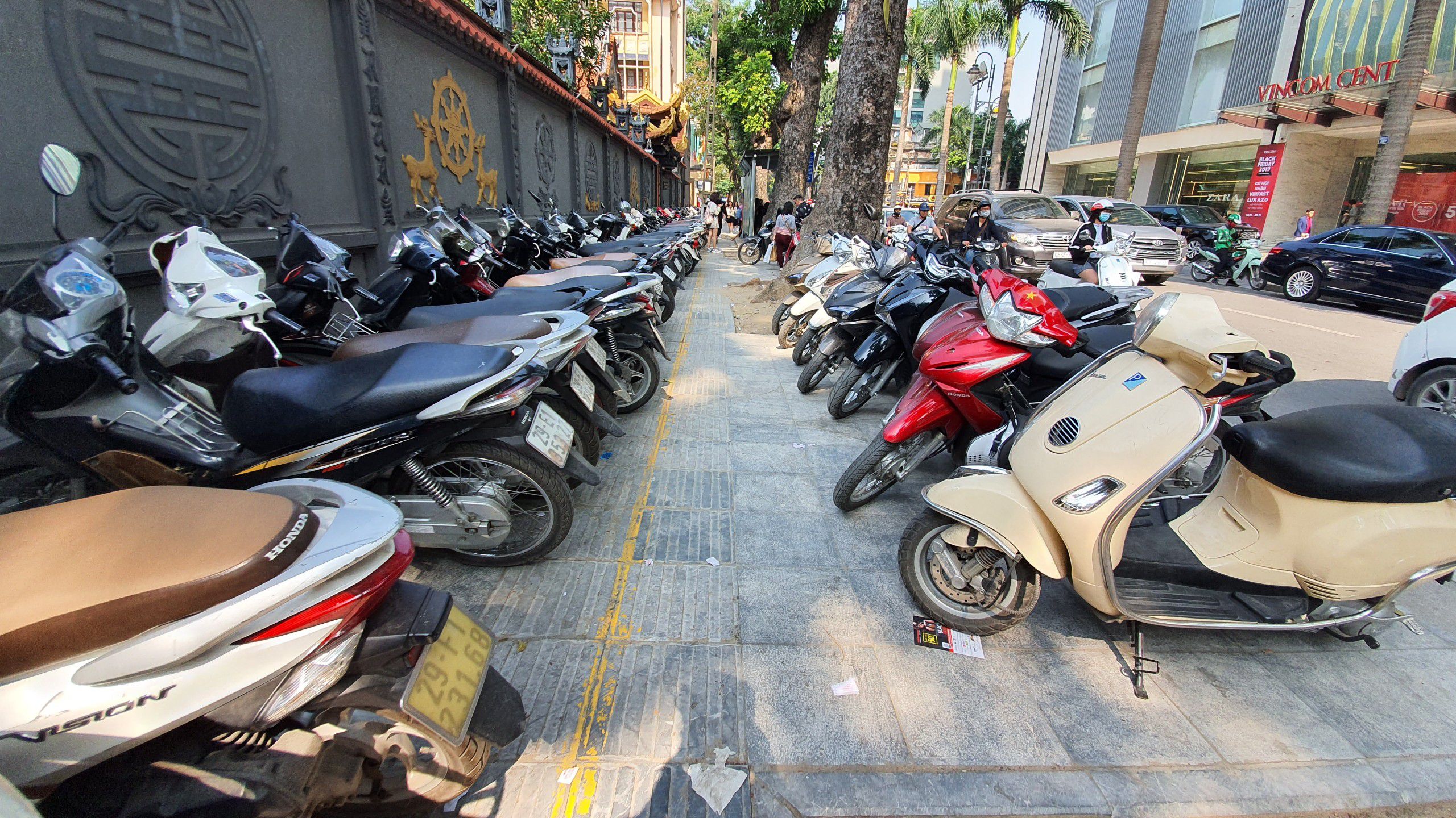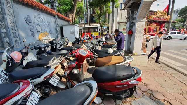 Chỉ sau 30 phút, khu vực vỉa hè trên đường Bà Triệu (đối diện Vincom) đã không nhận trông thêm xe do hết chỗ. Nhân viên trông giữ xe liên tục xua tay xuống phía dưới để người gửi tìm bãi khác.