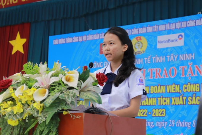 "Con thích học môn Văn. Trong nhà, người con yêu nhất là mẹ. Con có viết bài văn tả mẹ. Nhưng chưa có viết bài nào về mẹ là công nhân vì con chưa hiểu công việc của một người công nhân. Dù khó khăn Sách vở, tiền học mẹ đóng đầy đủ cho con. Con thích chiếc xe đạp này vì đúng màu con yêu thích, màu đỏ. Được tặng xe con rất vui vì giờ có thể đạp xe đi nhiều nơi như đi học, đi lên ngoại. Chợ xa quá nên con không đi chợ thay mẹ được. Có xe, mẹ con cũng yên tâm đi làm" - cháu Phạm Mỹ Huyền cho biết.