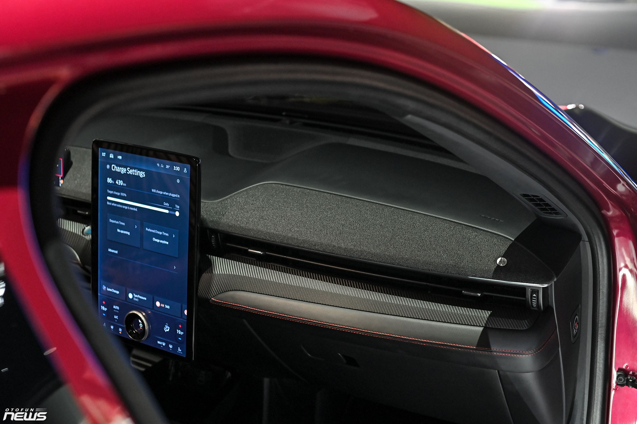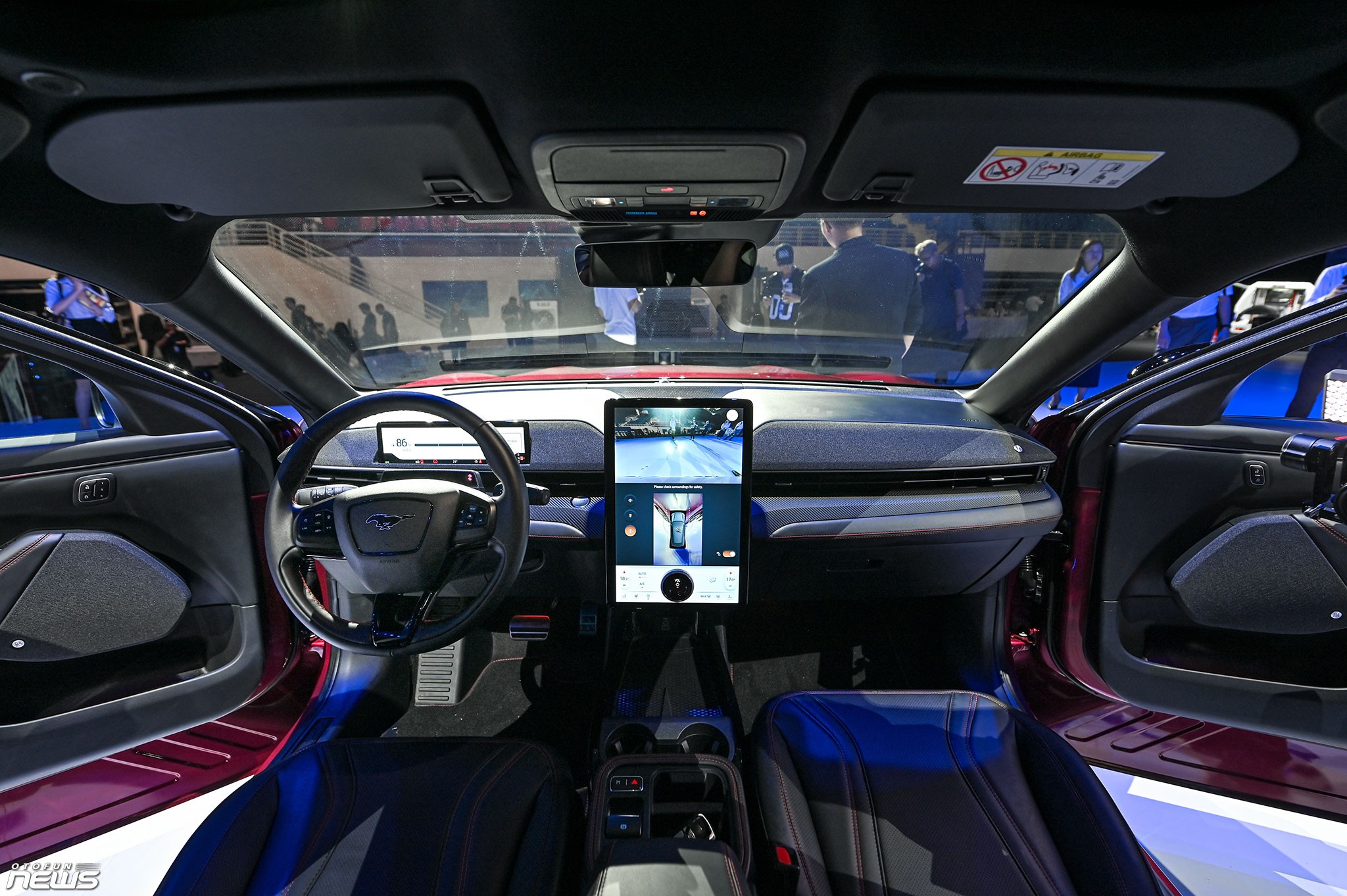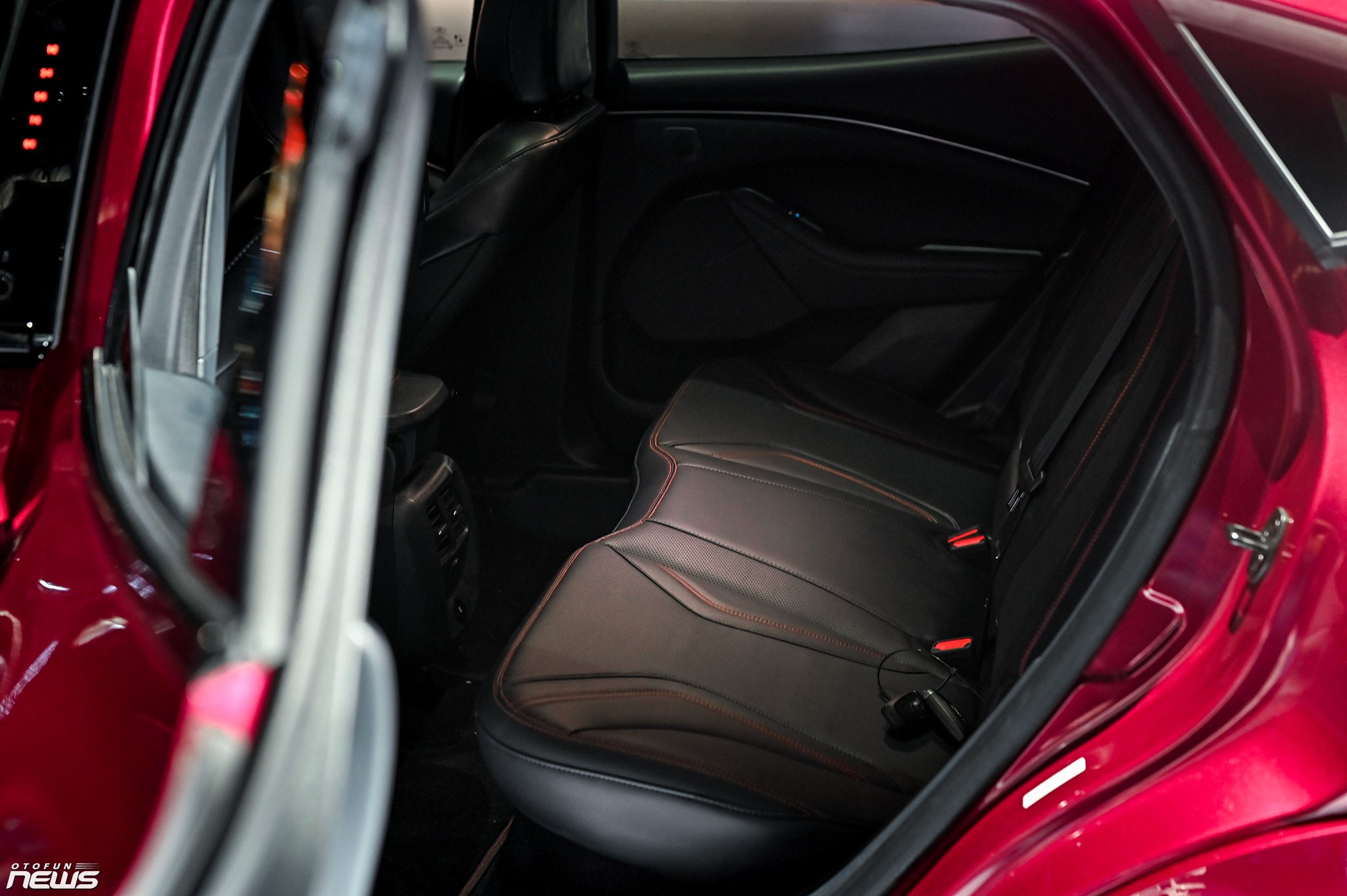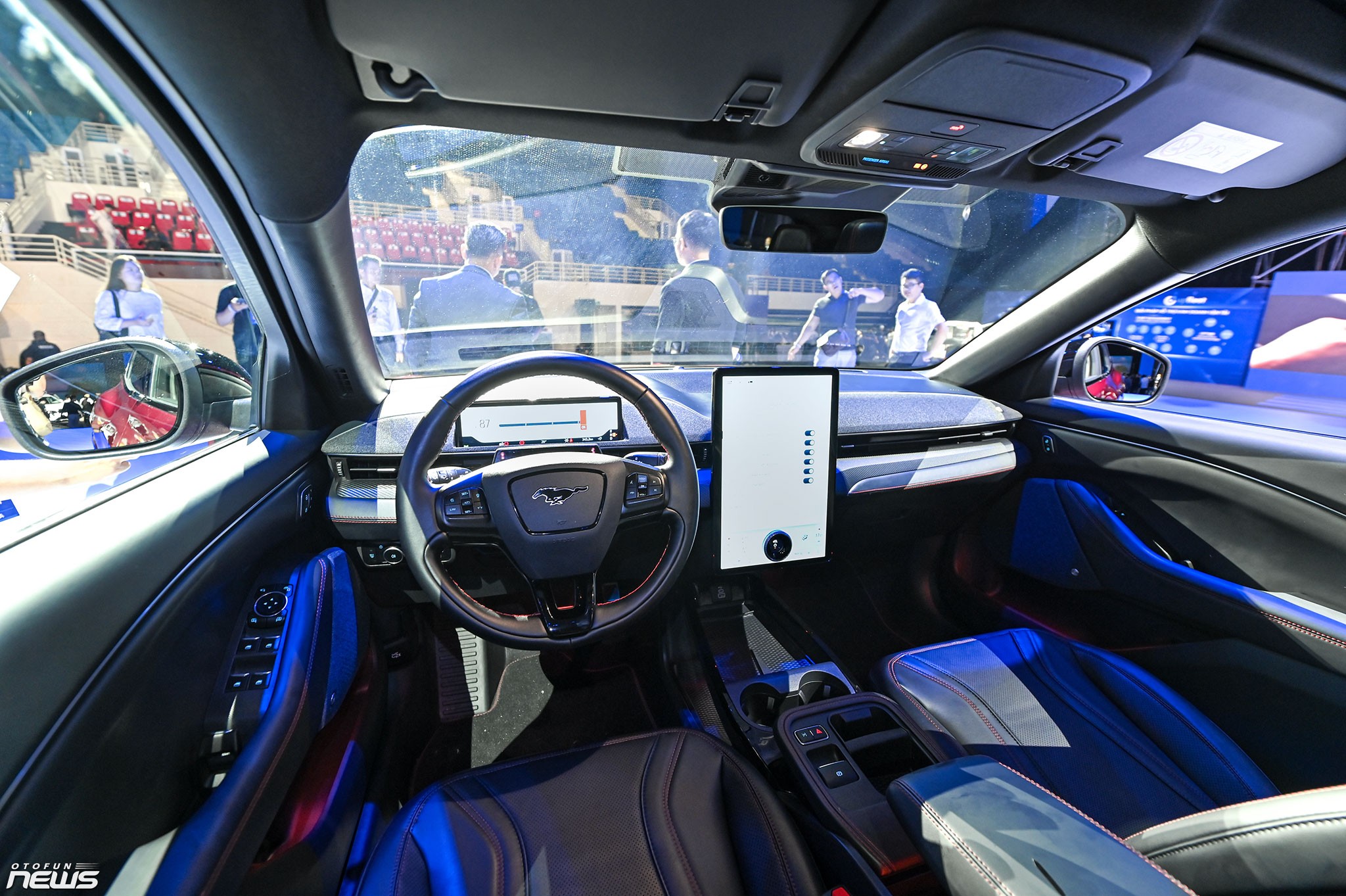 Tính thể thao còn thể hiện trong nội thất Mustang Mach-E, với các đường chỉ khâu tương phản trên ghế hay táp-lô. Ngoài ra, không gian bên trong thiết kế theo hướng đơn giản nhưng hiện đại. Các trang bị tiêu chuẩn của xe như màn hình cảm ứng giải trí 15,5 inch, đồng hồ tốc độ 10,2 inch, điều hòa tự động hai vùng, sạc không dây, 10 loa Bang & Olufsen. Hỗ trợ kết nối Apple CarPlay/Android không dây.
