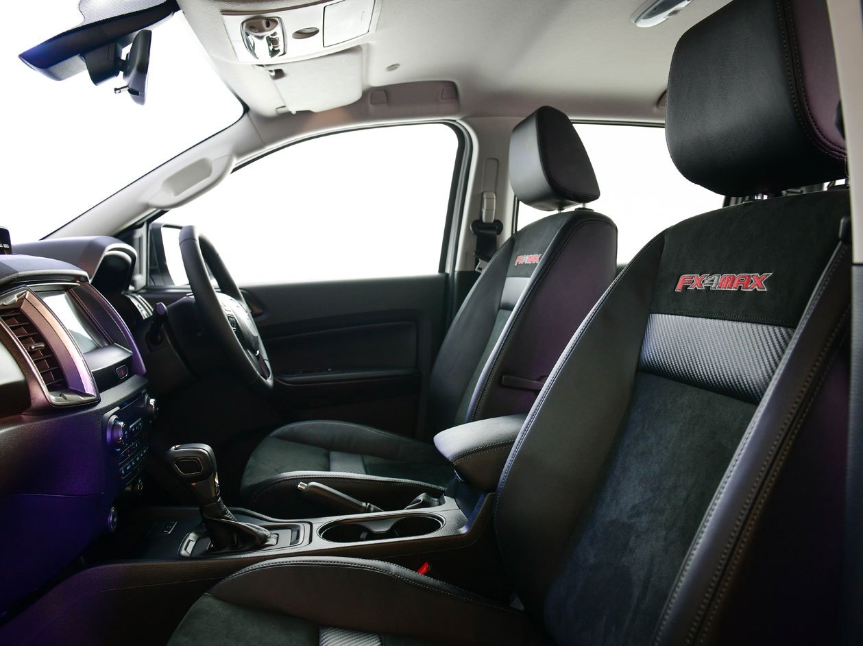 Bên trong, nội thất Ranger FX4 Max được bọc Alcantara và nhung tổng hợp. Ghế lái chỉnh điện 6 hướng, ký tự FX4 Max được thêu màu đỏ trên tựa lưng ghế. Cụm đồng hồ công cụ đi kèm màn hình đa thông tin 4.2 inch, trong khi hệ thống thông tin giải trí SYNC 3 đi kèm màn hình cảm ứng 8 inch, tương thích Apple CarPlay và Android Auto. Bộ chuyển mạch off-road với 6 cổng AUX điều khiển các thiết bị như tời, thanh đèn trợ sáng hoặc các phụ kiện cần thiết để đi địa hình, máy phát điện 250 amp để giảm tải cho ắc quy đậm chất thể thao.