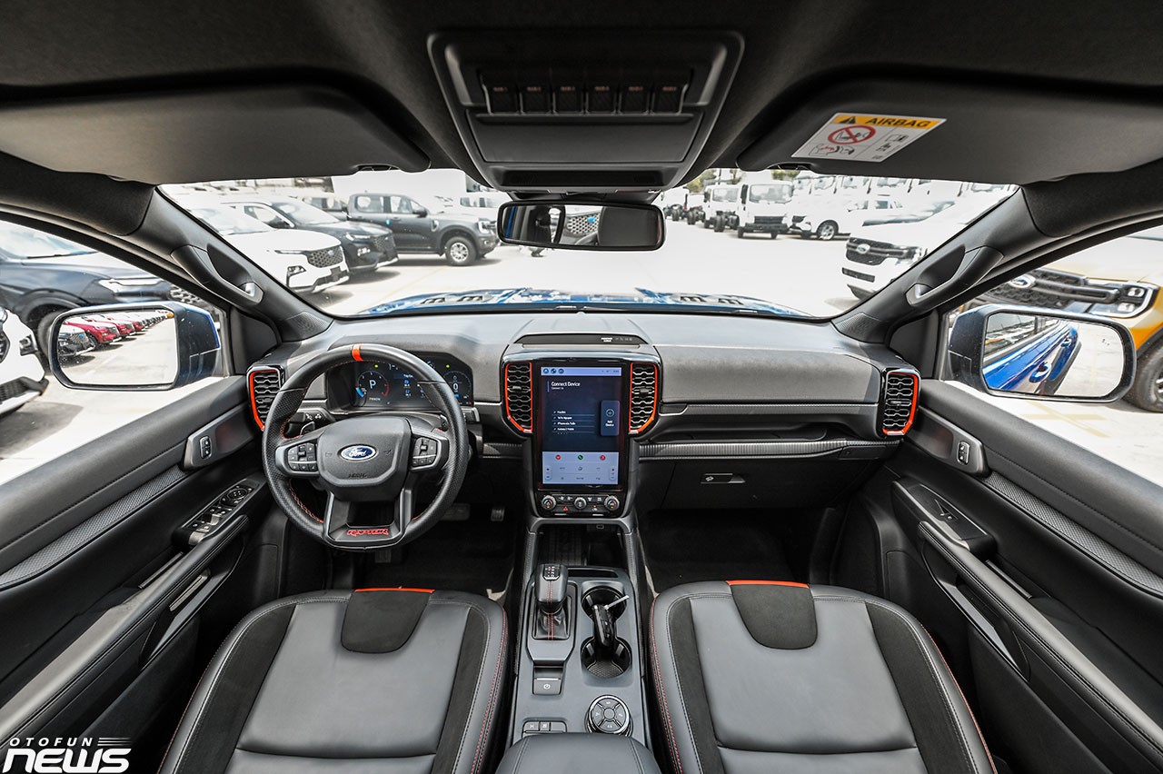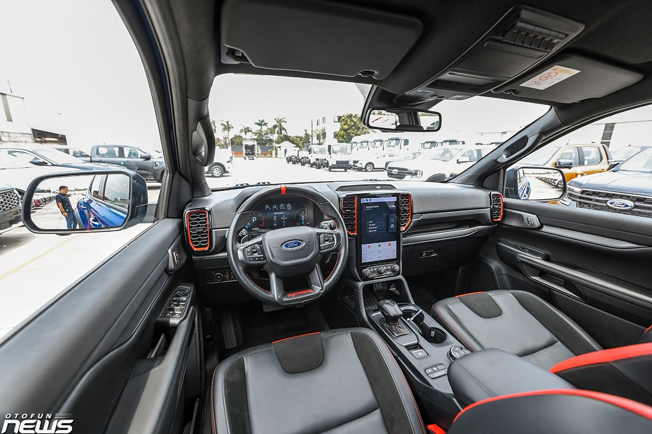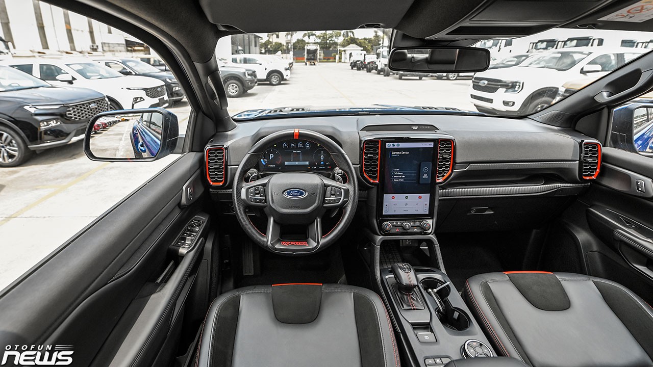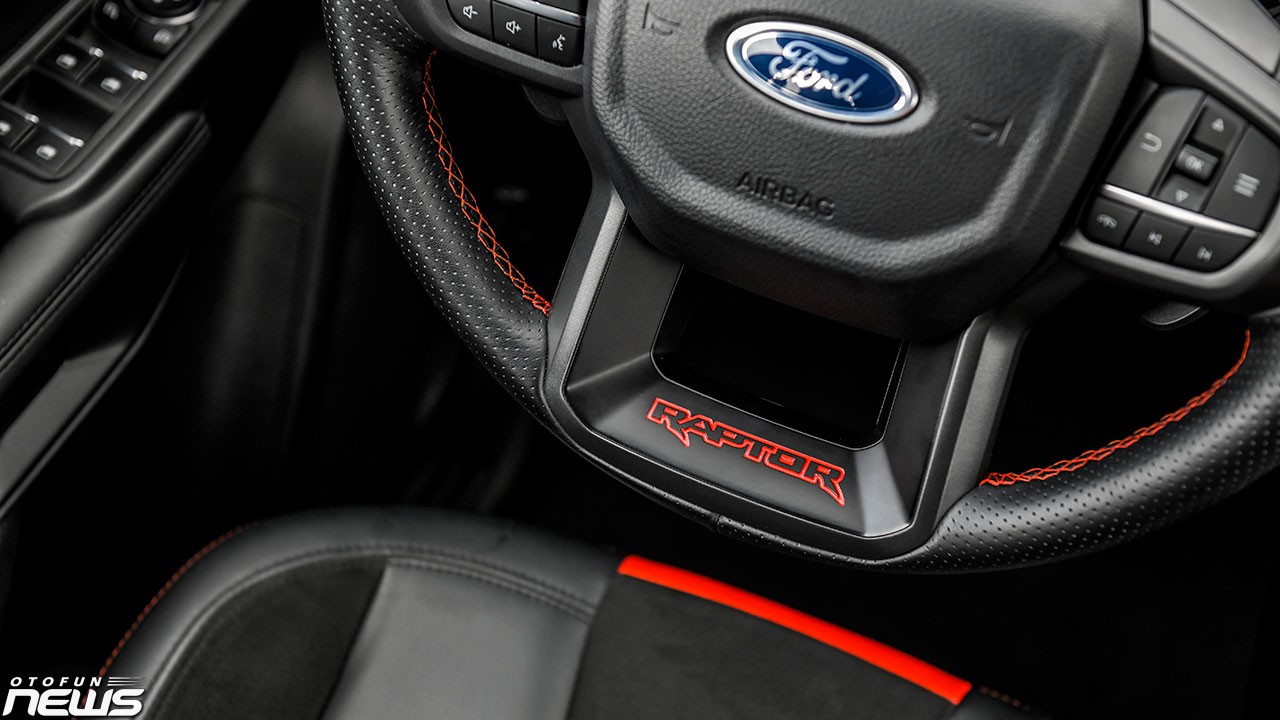Vào bên trong, nội thất của Ranger Raptor được bổ sung nhiều tính năng so với các phiên bản Ranger thông thường. Vô-lăng 4 chấu bọc da màu đen, có chỉ dấu vị trí 12h như xe đua và tích hợp thêm lẫy chuyển số phía sau.