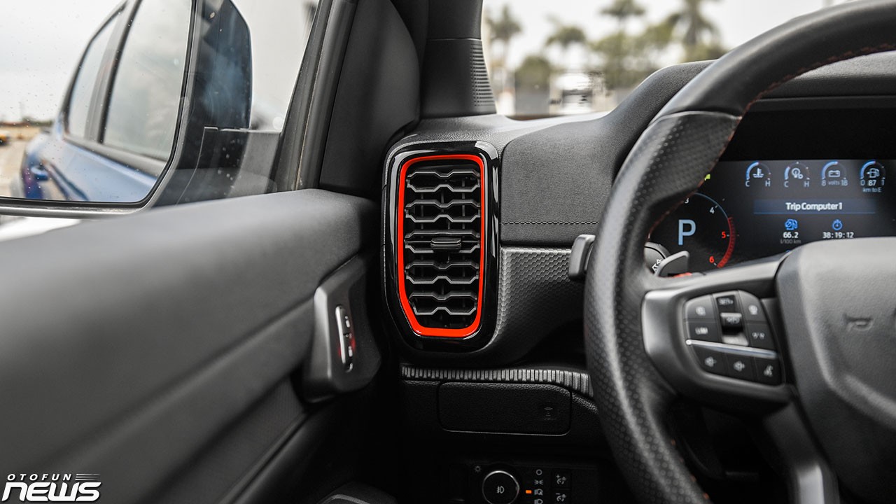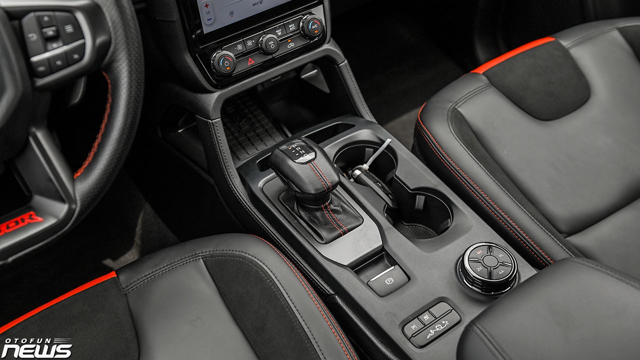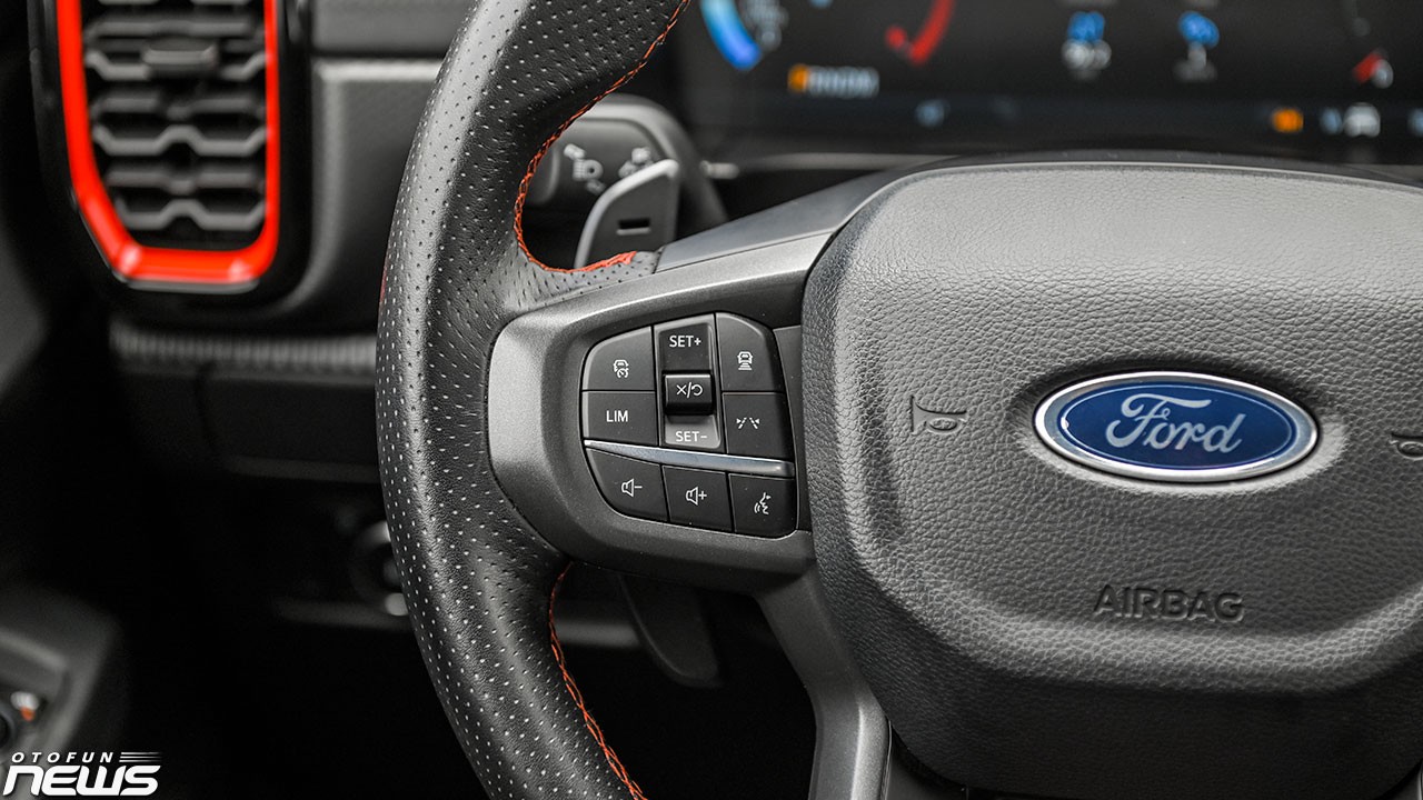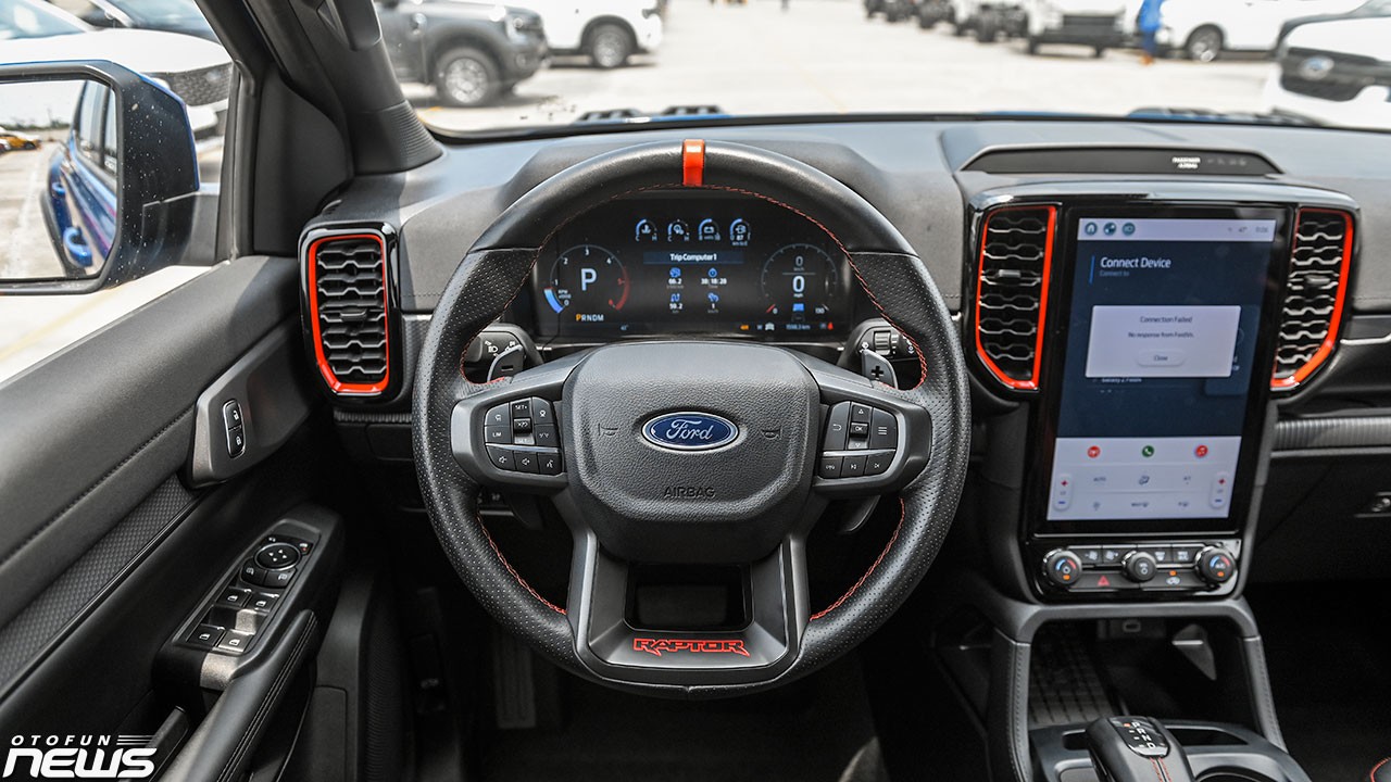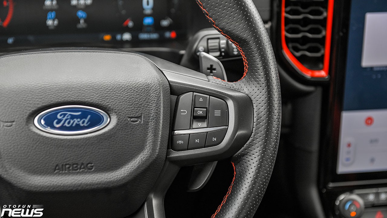 Vào bên trong, nội thất của Ranger Raptor được bổ sung nhiều tính năng so với các phiên bản Ranger thông thường. Vô-lăng 4 chấu bọc da màu đen, có chỉ dấu vị trí 12h như xe đua và tích hợp thêm lẫy chuyển số phía sau.