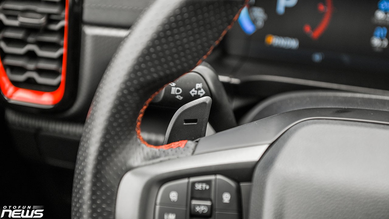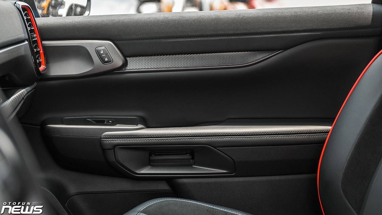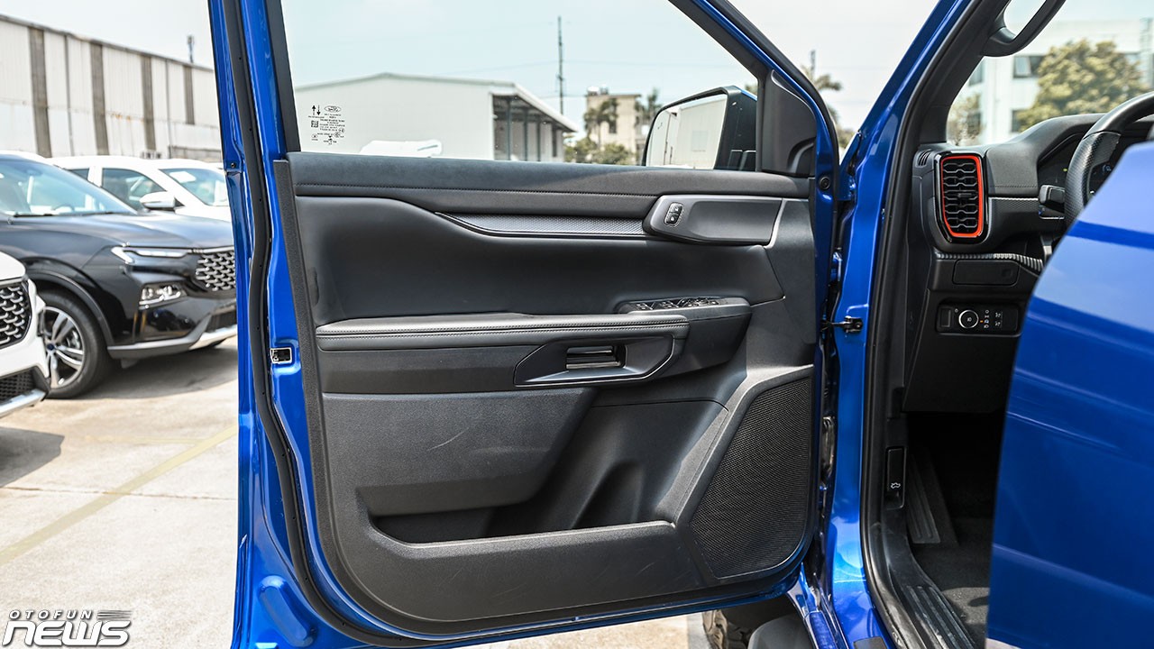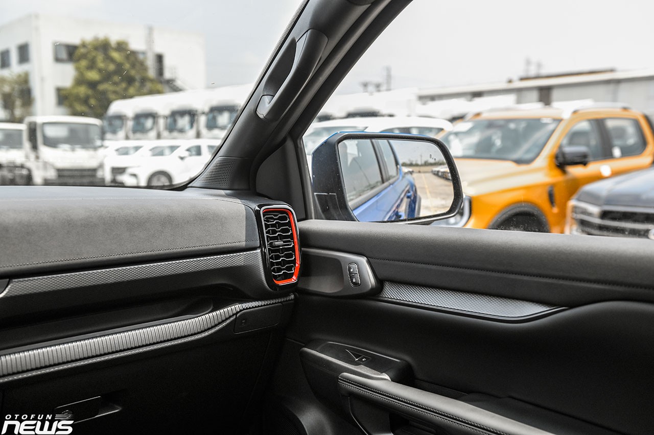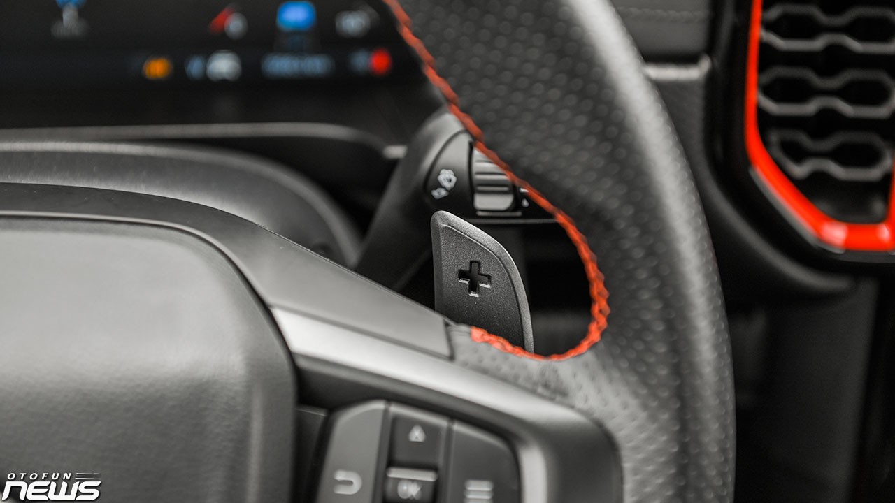 Vào bên trong, nội thất của Ranger Raptor được bổ sung nhiều tính năng so với các phiên bản Ranger thông thường. Vô-lăng 4 chấu bọc da màu đen, có chỉ dấu vị trí 12h như xe đua và tích hợp thêm lẫy chuyển số phía sau.