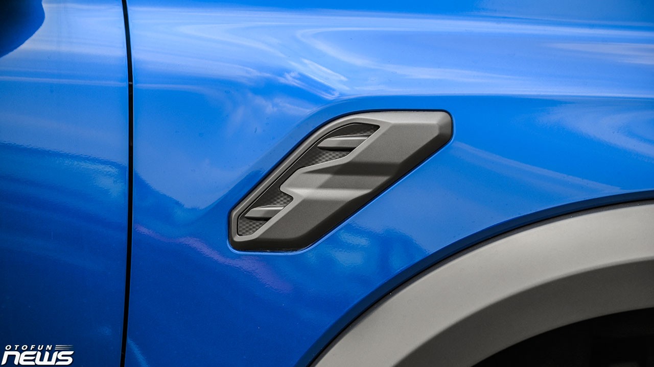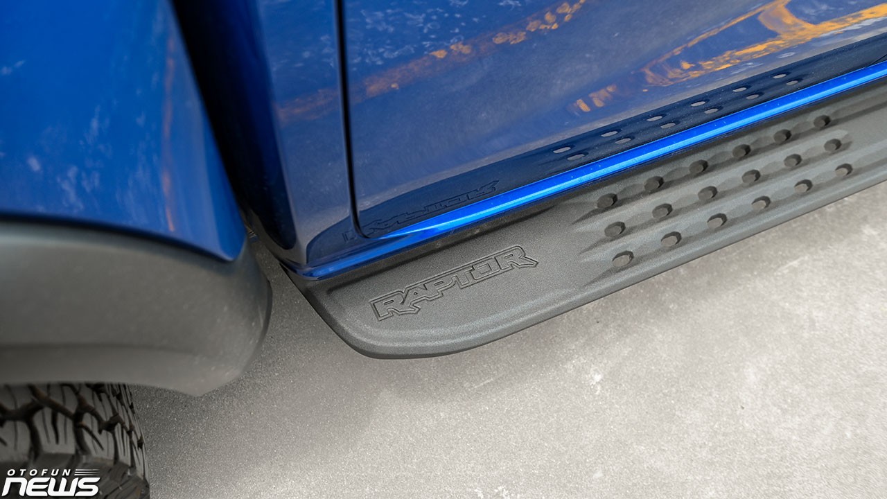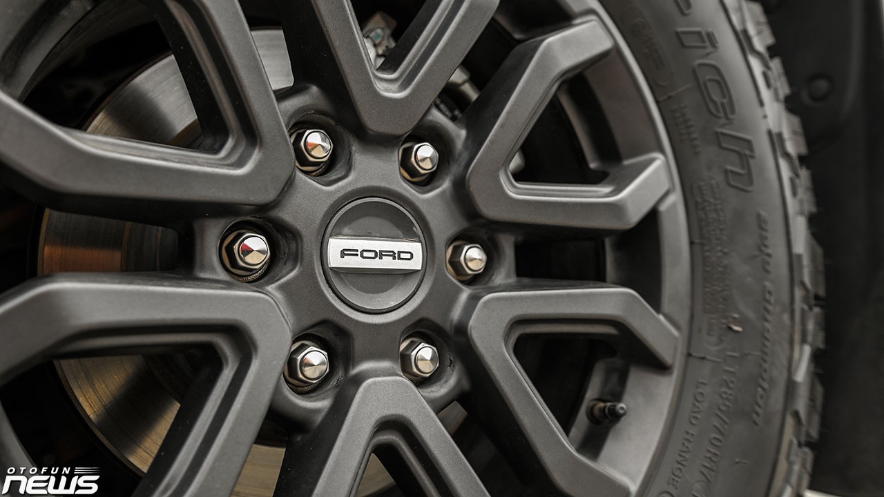 Vẻ nam tính được tô điểm với nhiều chi tiết màu đen nhám. Lưới tản nhiệt với dòng chữ FORD to bản nổi bật ở phần đầu xe. Tiếp theo đó là cản trước, cản sau, các ốp hốc bánh hai bên cũng như bậc bước chân cỡ lớn. Bộ tem Raptor với dòng chữ gắn ở sau và hai bên nắp thùng cũng mang lại cái nhìn ấn tượng. Mâm xe 17 inch độc quyền, sử dụng lốp AT đến từ BF Goodrich với đường kính tới 32 inch.