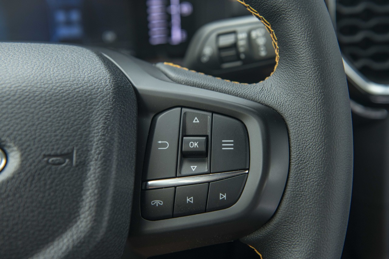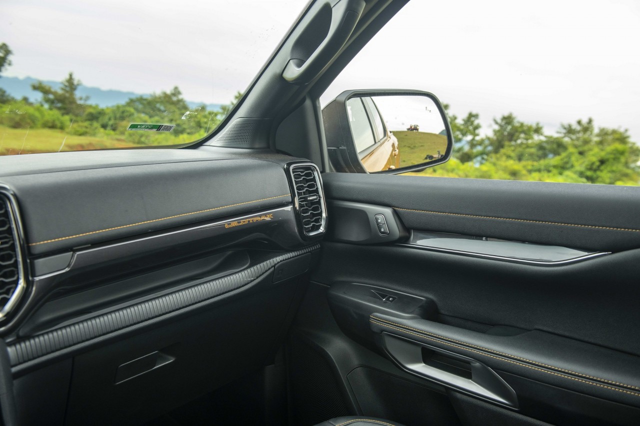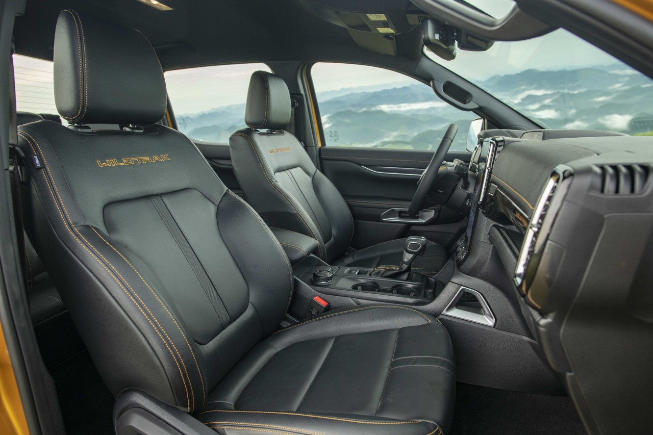 Vào bên trong, khoang nội thất của Ford Ranger Wildtrak 2022 được thiết kế lại hoàn toàn. Ghế ngồi bọc da, ghế lái chỉnh điện 8 hướng. Vô-lăng 4 chấu bọc da thêu chỉ đỏ, tích hợp loạt phím bấm chức năng. Đồng hồ sau vô-lăng dạng kỹ thuật số với màn hình kích thước 8 inch hiển thị các thông tin về hành trình, hỗ trợ lái cũng như offroad.