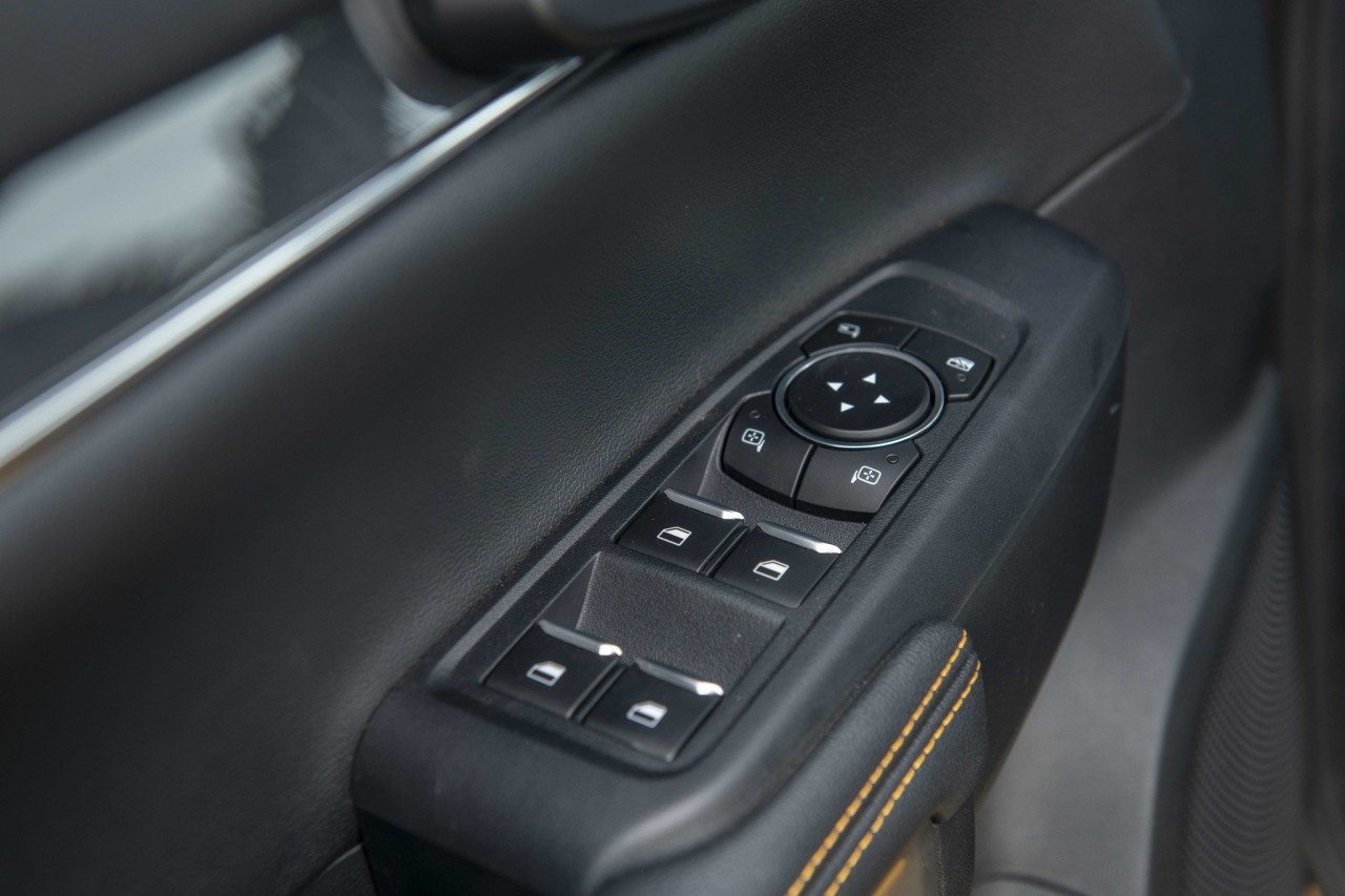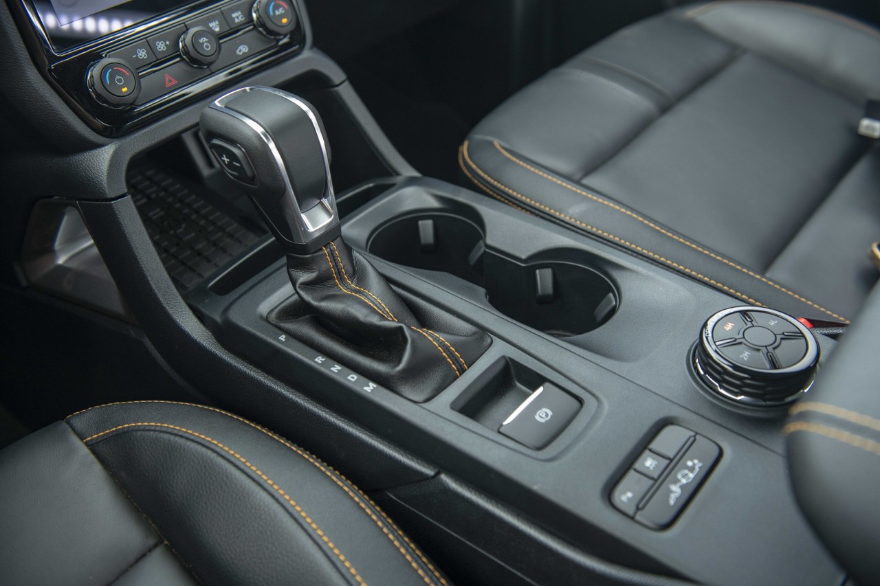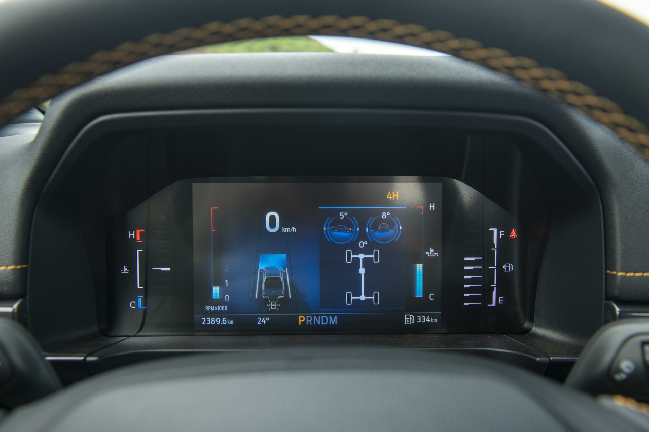 Vào bên trong, khoang nội thất của Ford Ranger Wildtrak 2022 được thiết kế lại hoàn toàn. Ghế ngồi bọc da, ghế lái chỉnh điện 8 hướng. Vô-lăng 4 chấu bọc da thêu chỉ đỏ, tích hợp loạt phím bấm chức năng. Đồng hồ sau vô-lăng dạng kỹ thuật số với màn hình kích thước 8 inch hiển thị các thông tin về hành trình, hỗ trợ lái cũng như offroad.
