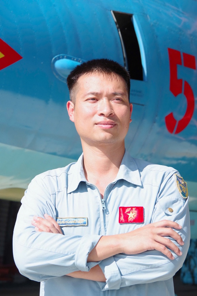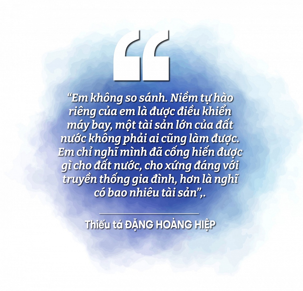 | Hiệp khẳng định, dù khó khăn, nguy hiểm luôn cận kề nhưng lòng yêu nghề và trách nhiệm, ham thích bay vẫn lớn hơn mọi khó khăn. Hiệp kể, giai đoạn huấn luyện bay đầu tiên trên máy bay sơ cấp là khó khăn nhất, vì phi công bước đầu tiếp xúc với không gian khác hẳn mặt đất, điều khiển máy bay không phải lúc nào cũng kiểm soát được ngay. Anh thử hình dung nhé, phi công phải điều khiển cả khối sắt nặng hàng chục tấn bay lên trời, bay quen rồi lại phải huấn luyện các khoa mục chiến đấu, bay ở các trạng thái phức tạp, các loại độ cao, tốc độ, … gần giới hạn máy bay, cho nên tiềm ẩn nguy cơ mất an toàn rất lớn. Mẹ và vợ lo lắm phải không? Vâng, nhất là mẹ em. Nghe tin có tai nạn là mẹ lại khuyên: “Thôi, con xin chuyển xuống mặt đất đi, nhà mình chỉ có mình con là con trai trưởng”. Em phải bảo mẹ: “Rủi ro không chỉ có máy bay, đi đường cũng có mà mẹ. Quan trọng là mình cẩn thận, tỉ mỉ, nắm chắc quy trình bay thì không sao mẹ ạ”. So với bạn bè cùng trang lứa làm kinh doanh, thu nhập cao, thời gian tự do, em có thấy mình thiệt thòi không? Không anh! - Thiếu tá Đặng Hoàng Hiệp đáp ngay - Em không so sánh. Niềm tự hào riêng của em là được điều khiển máy bay, một tài sản lớn của đất nước không phải ai cũng làm được.