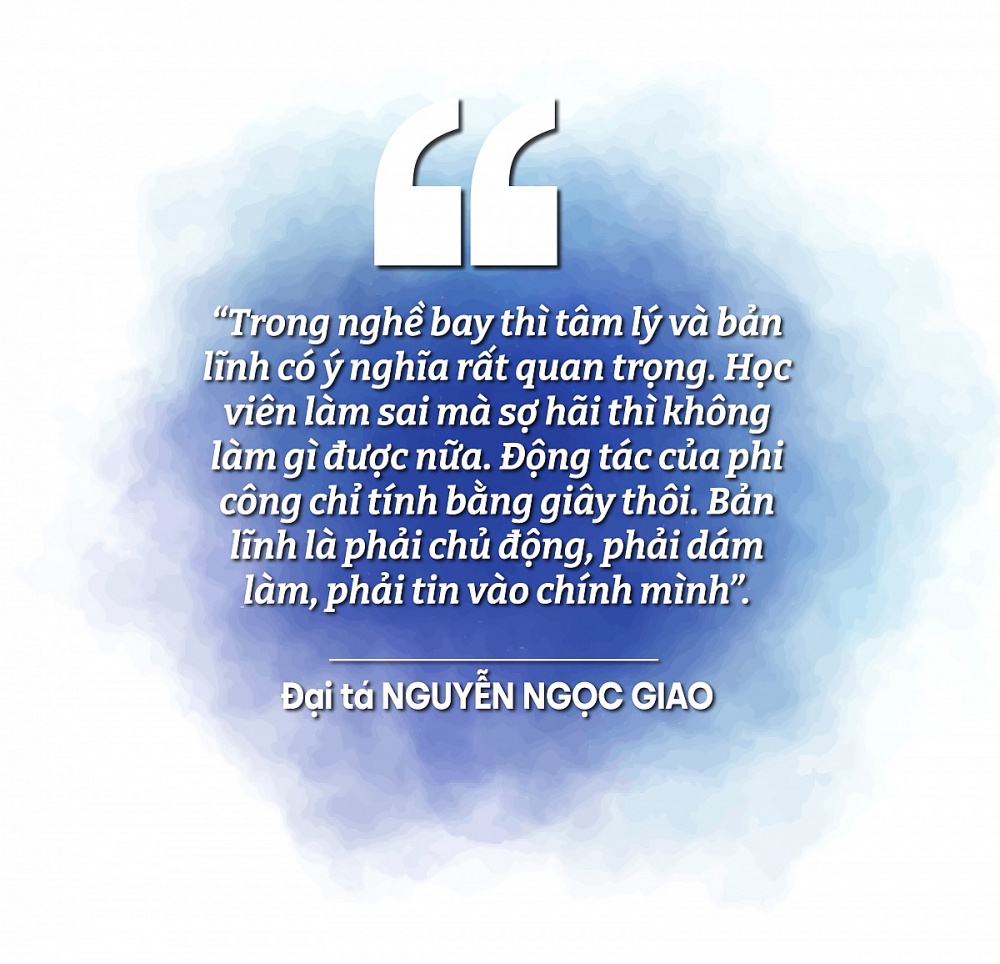 | Buổi sáng, nắng vàng trải dài trên đường băng. Tôi ngồi đối diện Đại tá Nguyễn Ngọc Giao, Phi công cấp 1, Trung đoàn trưởng Trung đoàn 937, Sư đoàn 370, Quân chủng Phòng không - Không quân, hiện nay anh là Phó trưởng phòng Quân huấn, Sư đoàn 370, Quân chủng Phòng không - Không quân với gần 2000 giờ bay. Ông mặc bộ đồ bay chỉnh tề, khuôn mặt phong trần, đôi mắt sâu thẳm như chứa đựng cả bầu trời rộng lớn. “Anh Giao ơi, anh có thể kể cho em nghe bản lĩnh của một phi công là gì không ạ?”, tôi mở lời. Đại tá Nguyễn Ngọc Giao khẽ cười, giọng trầm ấm: “Trong nghề bay thì tâm lý và bản lĩnh có ý nghĩa rất quan trọng. Học viên làm sai mà sợ hãi thì không làm gì được nữa. Động tác của phi công chỉ tính bằng giây thôi. Bản lĩnh là phải chủ động, phải dám làm, phải tin vào chính mình”.