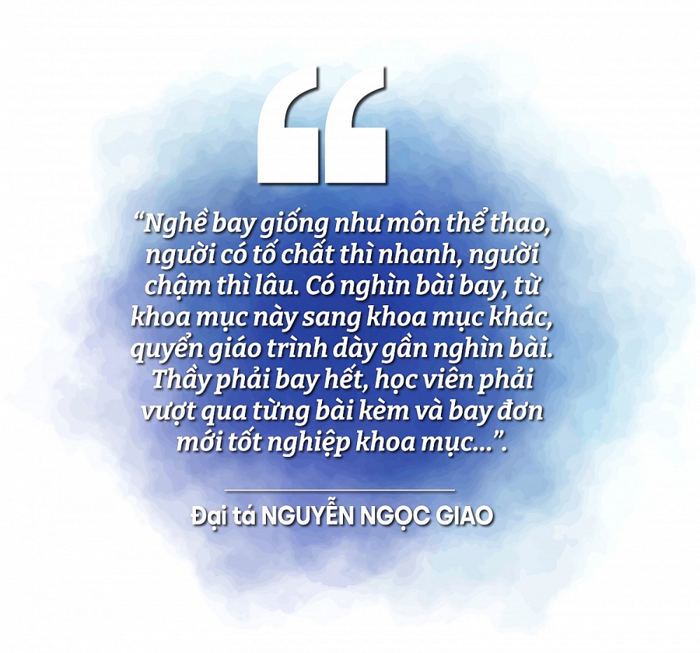 Ông dừng lại một chút, mắt nhìn ra đường băng: Cuộc đời phi công có ba giai đoạn rõ rệt. Giai đoạn đầu là trò bắt chước thầy, gần như máy móc. Thầy bảo động tác nào làm đúng thì cứ thế phát huy, cái nào sai thì sửa, bảo phải nhanh thì làm nhanh, bảo phải chậm lại thì cứ thế mà thực hiện. Đó là giai đoạn vượt qua nỗi sợ hãi ban đầu khi đối mặt với máy bay chiến đấu – loại máy bay khác hẳn sơ cấp ở nhà trường, tính năng phức tạp, đòi hỏi rèn luyện lâu dài và tích lũy kinh nghiệm rất nhiều. Học viên từ nhà trường về, không phải 100% đều bay được ngay. Giai đoạn hai là chuyển kiến thức của thầy thành của mình. Hiểu bản chất tại sao phải làm thế, cảm nhận như thế nào. Và giai đoạn ba – cao nhất – là phát triển thêm, xây dựng “thương hiệu cá nhân”. Bay mỗi người một kiểu, mỗi người một cách, nhưng phải quy chuẩn trong số liệu, không được sai lệch vì ngoài khoảng ấy là mất an toàn, là có thể phải trả giá bằng tính mạng. Ông kể về môi trường trên không với áp suất thấp, oxy thiếu, phản xạ khác hẳn như khi ở mặt đất. Có người thích nghi rất nhanh, có người rất lâu. Có người sinh ra đã phù hợp với môi trường trên không, chịu được áp suất loãng, thiếu oxy. Đó là lý do khi tuyển chọn, người ta đã lọc rất kỹ về sức khỏe và cấu tạo cơ thể. “Nghề bay giống như môn thể thao”, ông nói tiếp, người có tố chất thì nhanh, người chậm thì lâu. Có nghìn bài bay, từ khoa mục này sang khoa mục khác, quyển giáo trình dày gần nghìn bài. Thầy phải bay hết, học viên phải vượt qua từng bài kèm và bay đơn mới tốt nghiệp khoa mục…