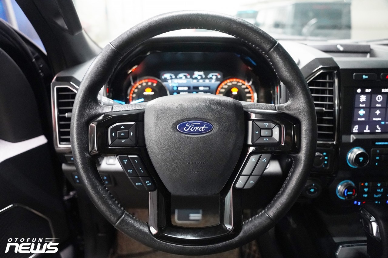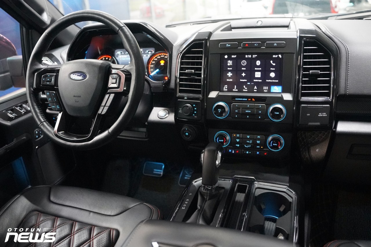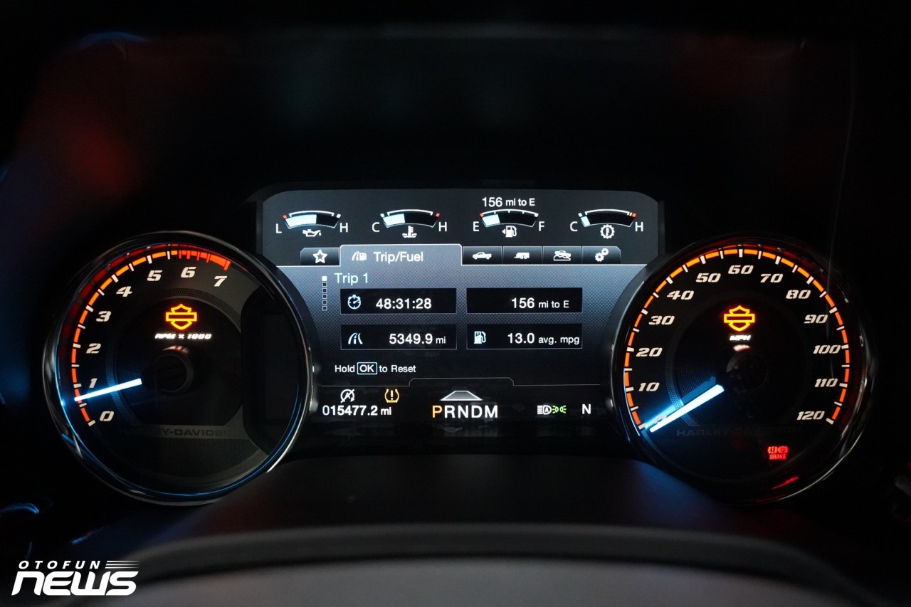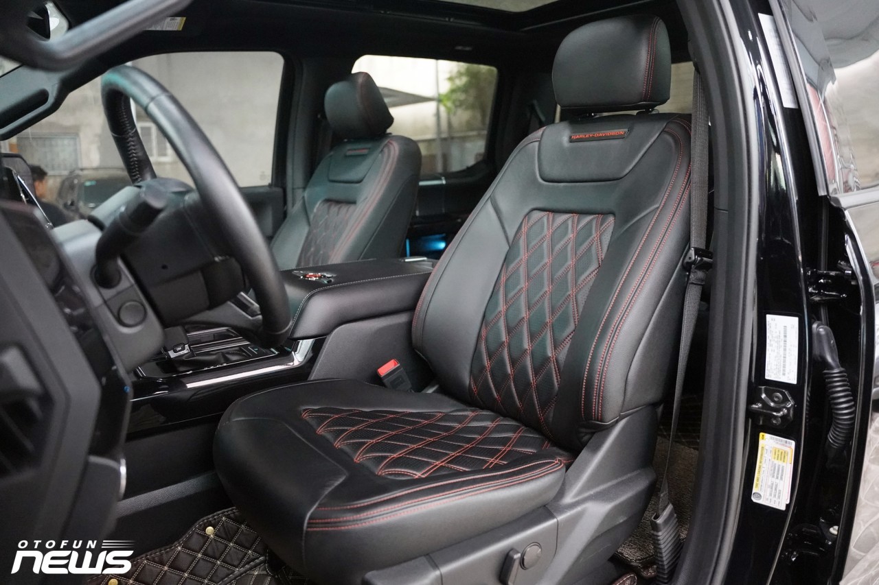 Vào bên trong, nội thất xe mang đậm phong cách một chiếc bán tải đến từ Mỹ. Các chi tiết đều được làm với kích thước lớn, dễ nhìn dễ sử dụng. Điểm khác biệt ở đây là những dấu ấn của Harley-Davidson mà Ford mang lên chiếc xe này.