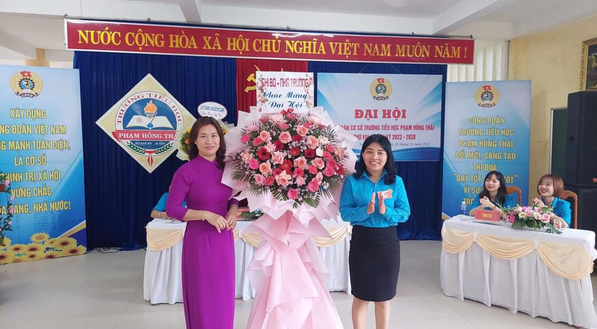 | Cô Nguyễn Thị Hồng cùng cô Bạch Thị Đào tại đại hội Công đoàn cơ sở Trường Tiểu học Phạm Hồng Thái. |