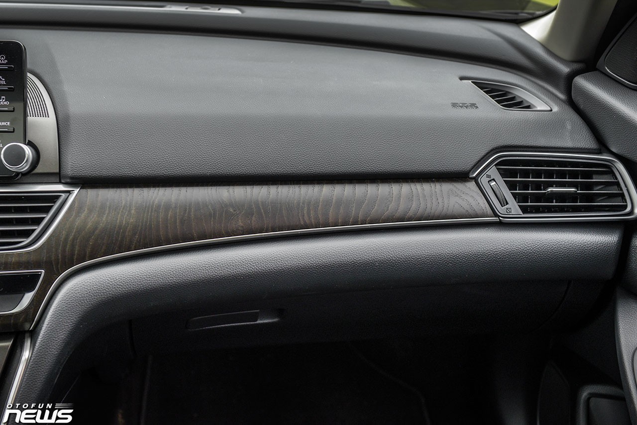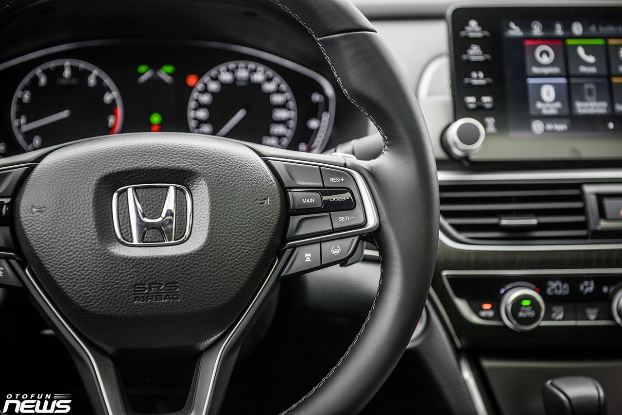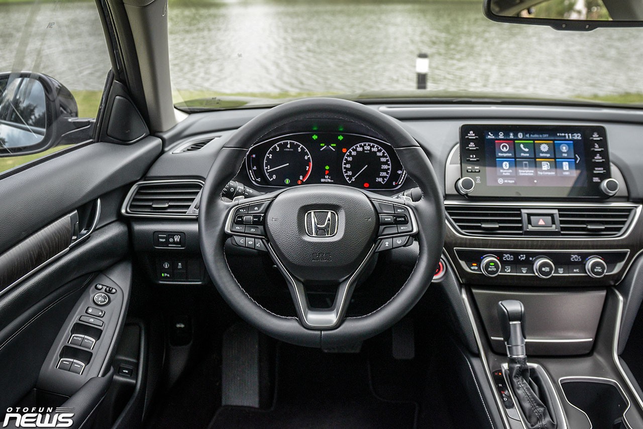 Vào bên trong, nội thất Accord sử dụng một lượng lớn vật liệu da và gỗ mang đến sự cao cấp những chiếc xe sang. Ghế ngồi bọc da, chỉnh điện tích hợp bơm hơi lưng. Vô-lăng ba chấu, bọc da cho cảm giác cầm nắm chân thực.